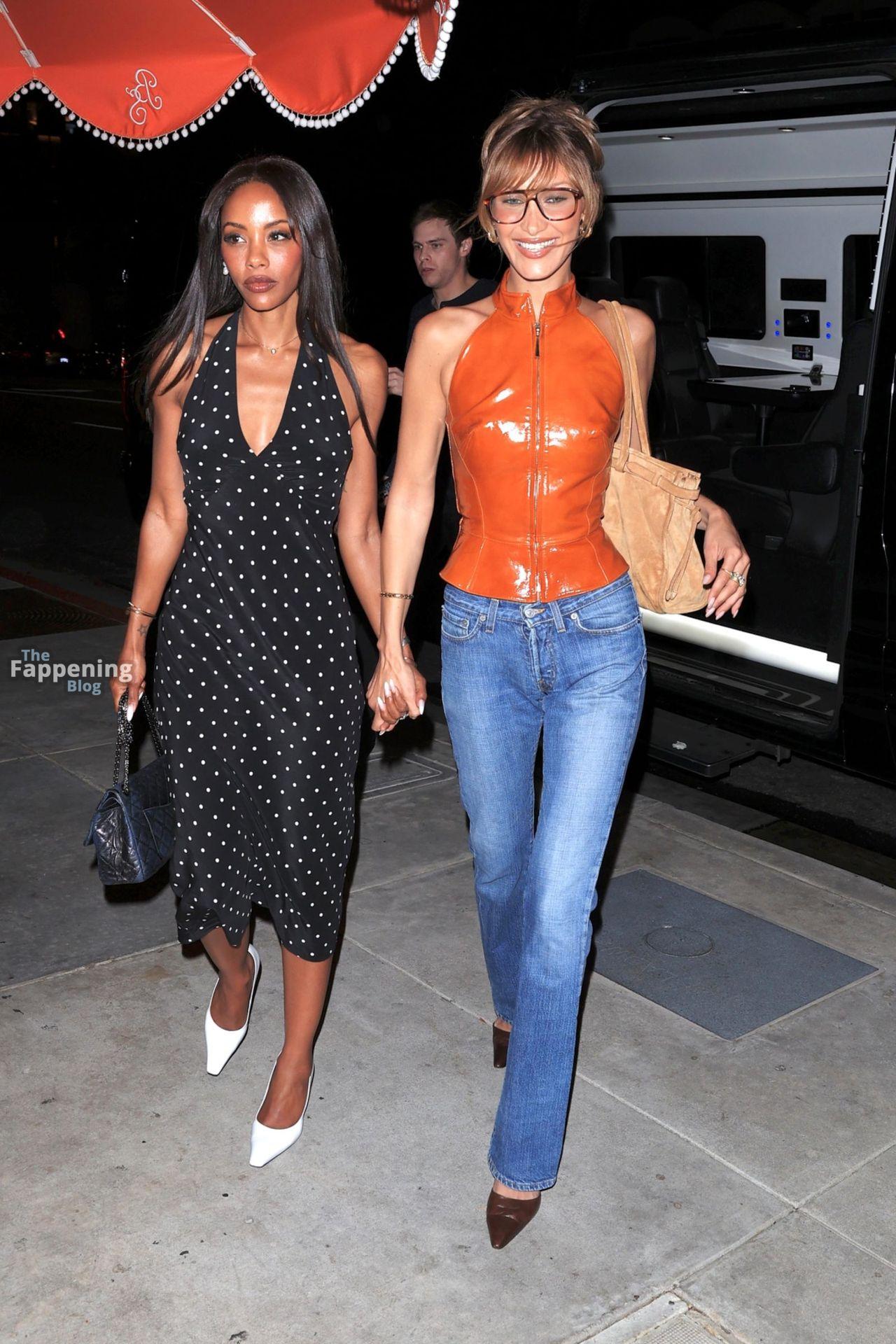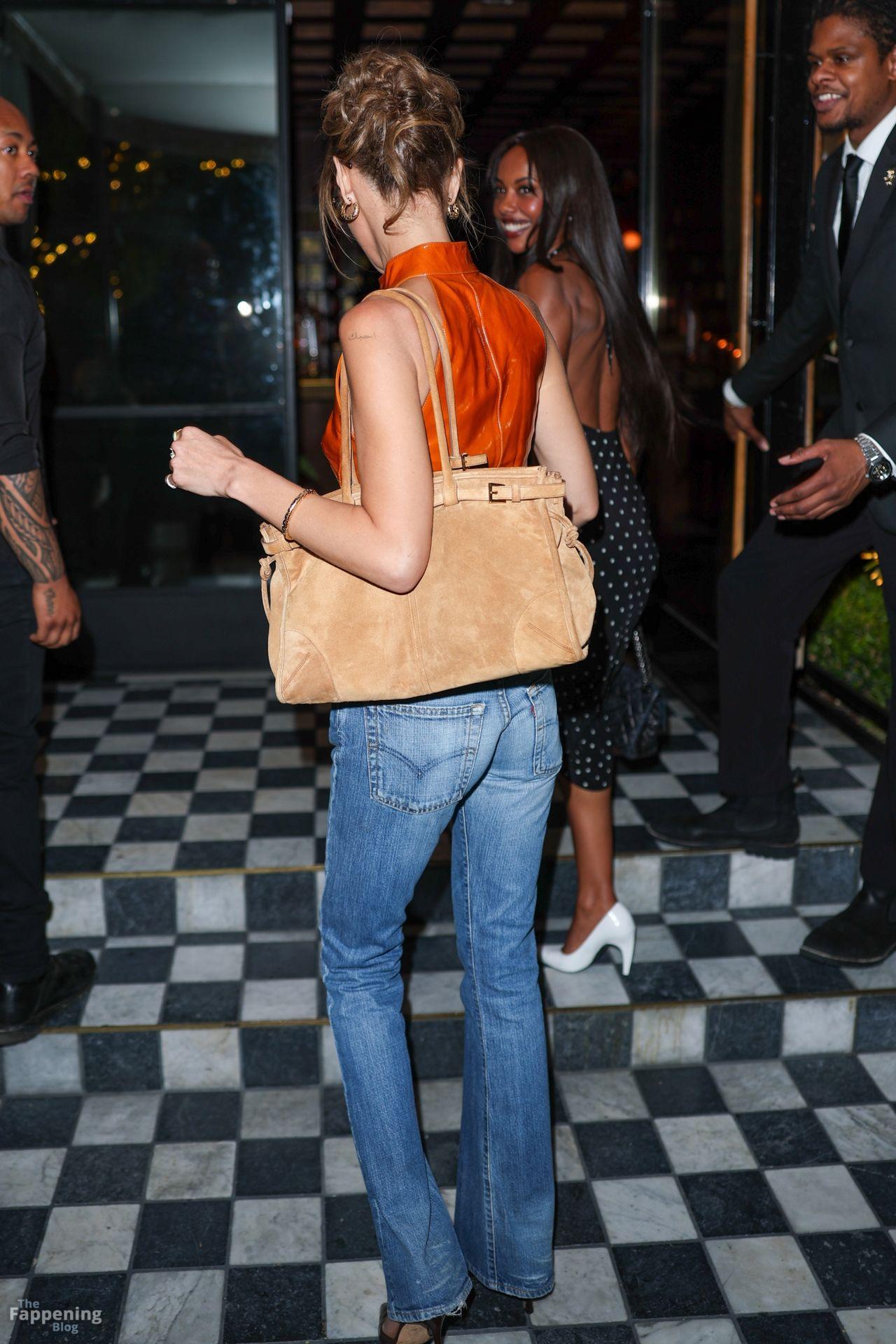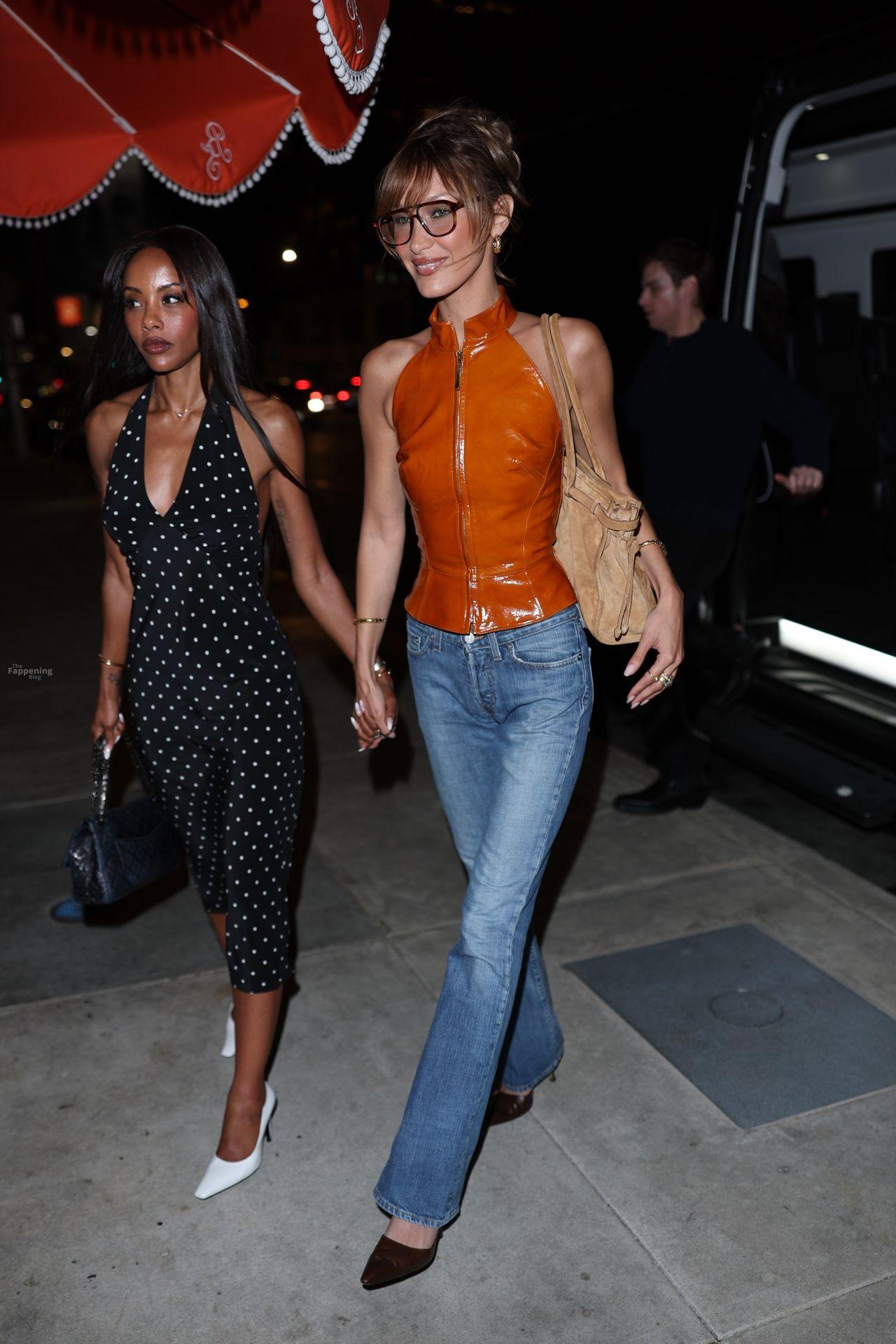 Bella Hadid is seen stepping out for dinner with friends at The Bird Street Club in West Hollywood, arriving in a sleek look featuring a fitted orange leather top, blue jeans, and heels as she exits her ride and heads inside for the night.