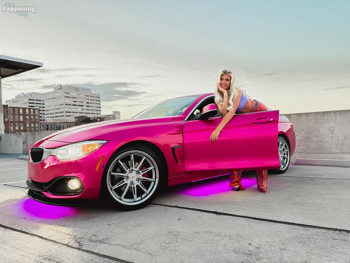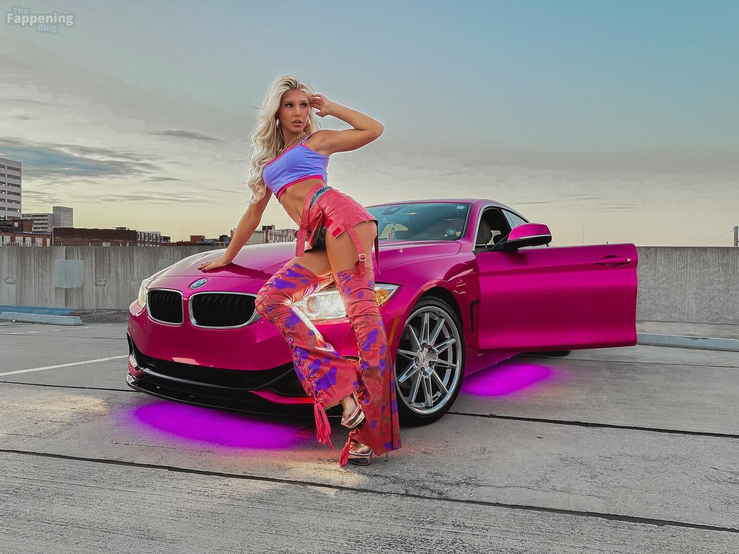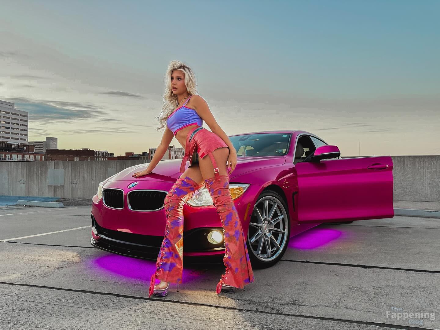 Brooklyn Riley killed it in a rooftop shoot, sportin’ a bright crop top, mini skirt, and boots beside a hot pink BMW.