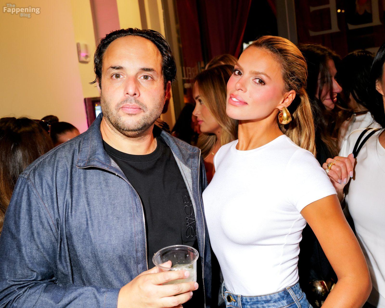 Check out Brooks Nader at the Vivrelle x REVOLVE|FWRD NYFW Pop-Up party in NYC on 09/11/2025, rockin’ a tight white tee, jeans, and leather jacket.