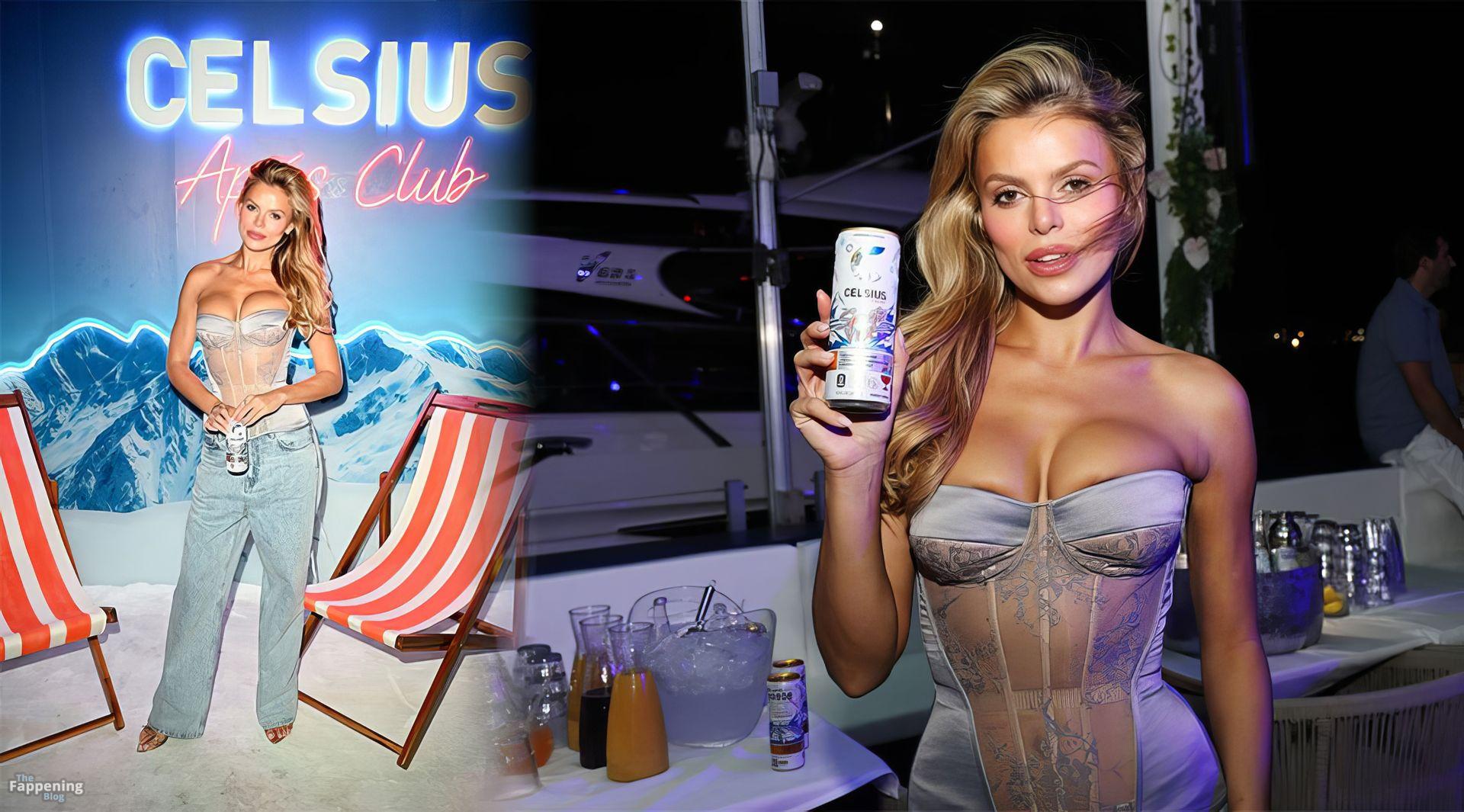 Brooks Nader was at the CELSIUS Spritz Vibe launch party. She showed up at the Palm Tree Club in a strapless, semi-sheer corset top with high-waisted light blue jean.