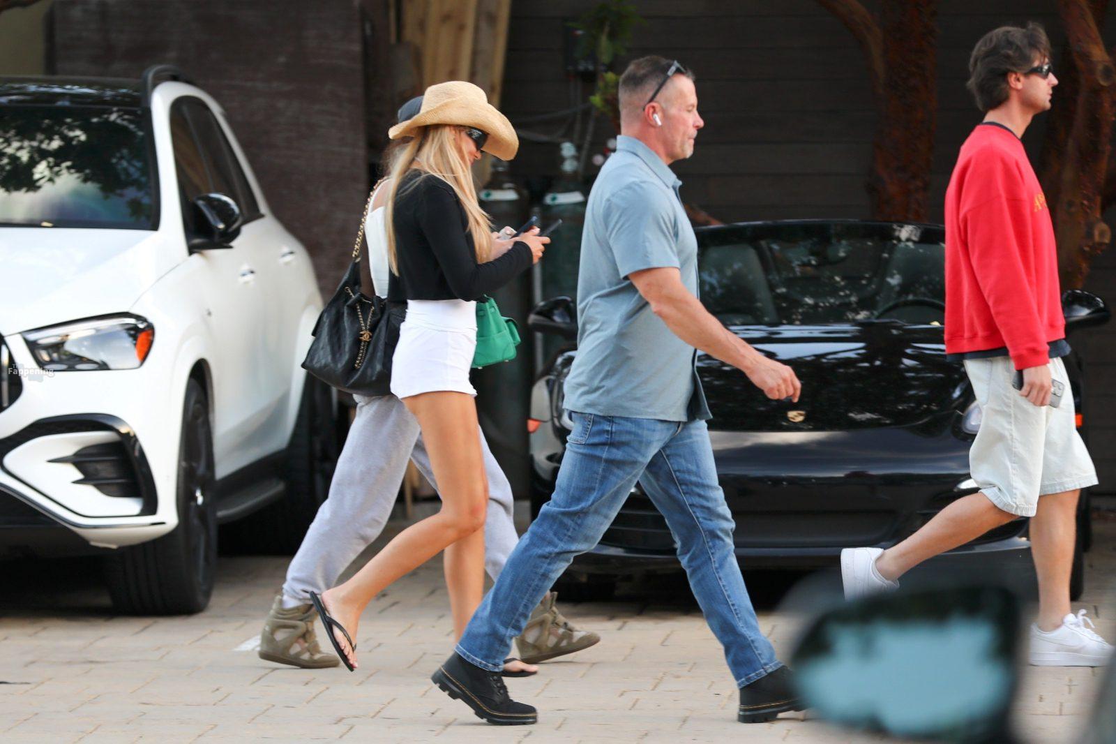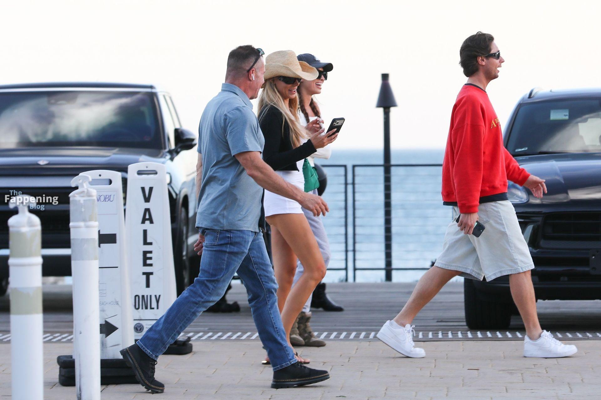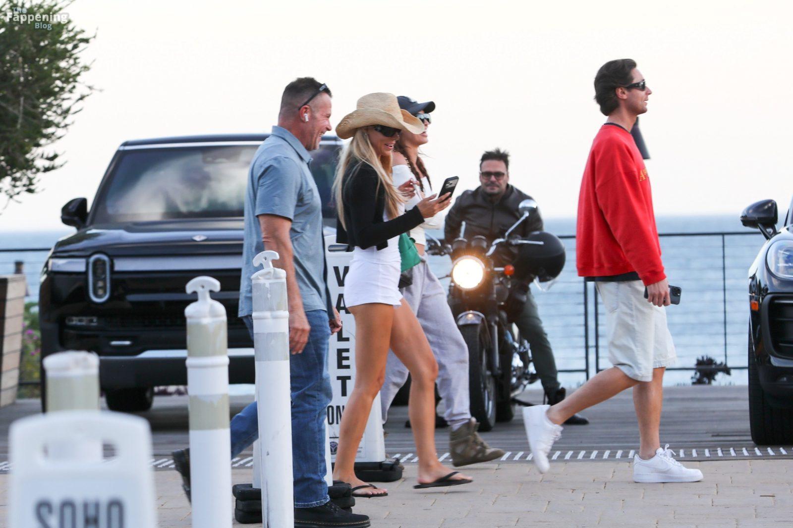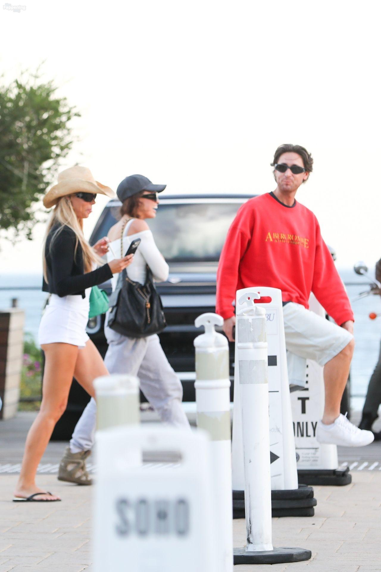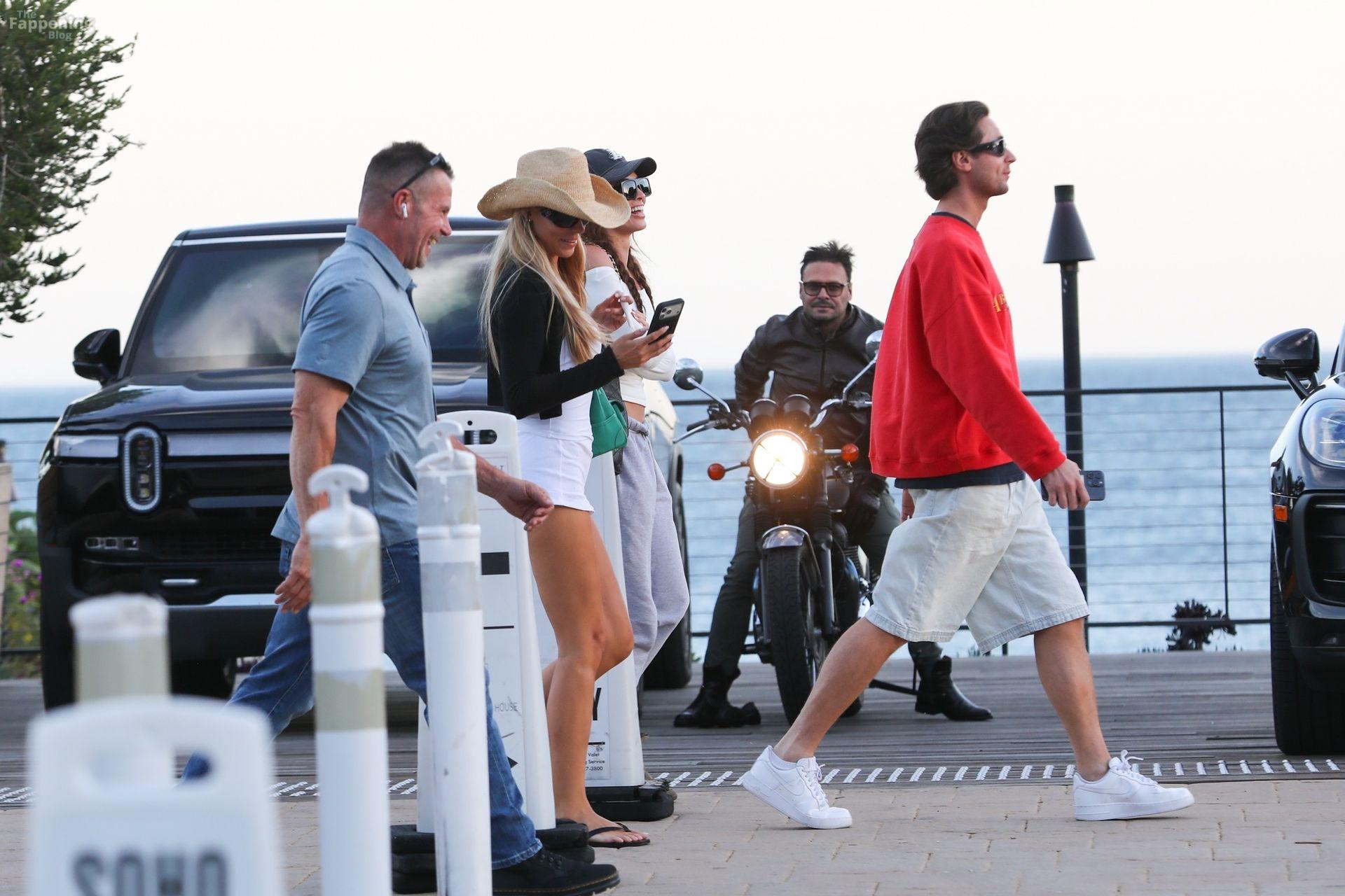 Brooks Nader steps out of Nobu in Malibu in a relaxed outfit, hat, short shorts and flip-flops before heading into Soho House with her sister.