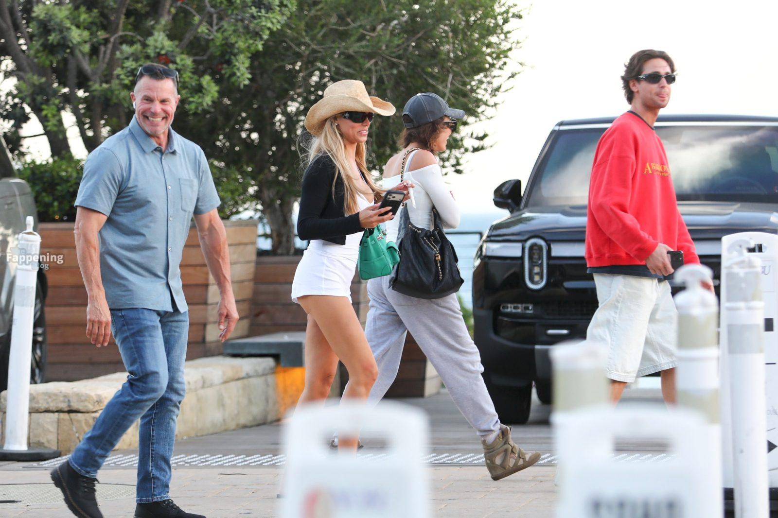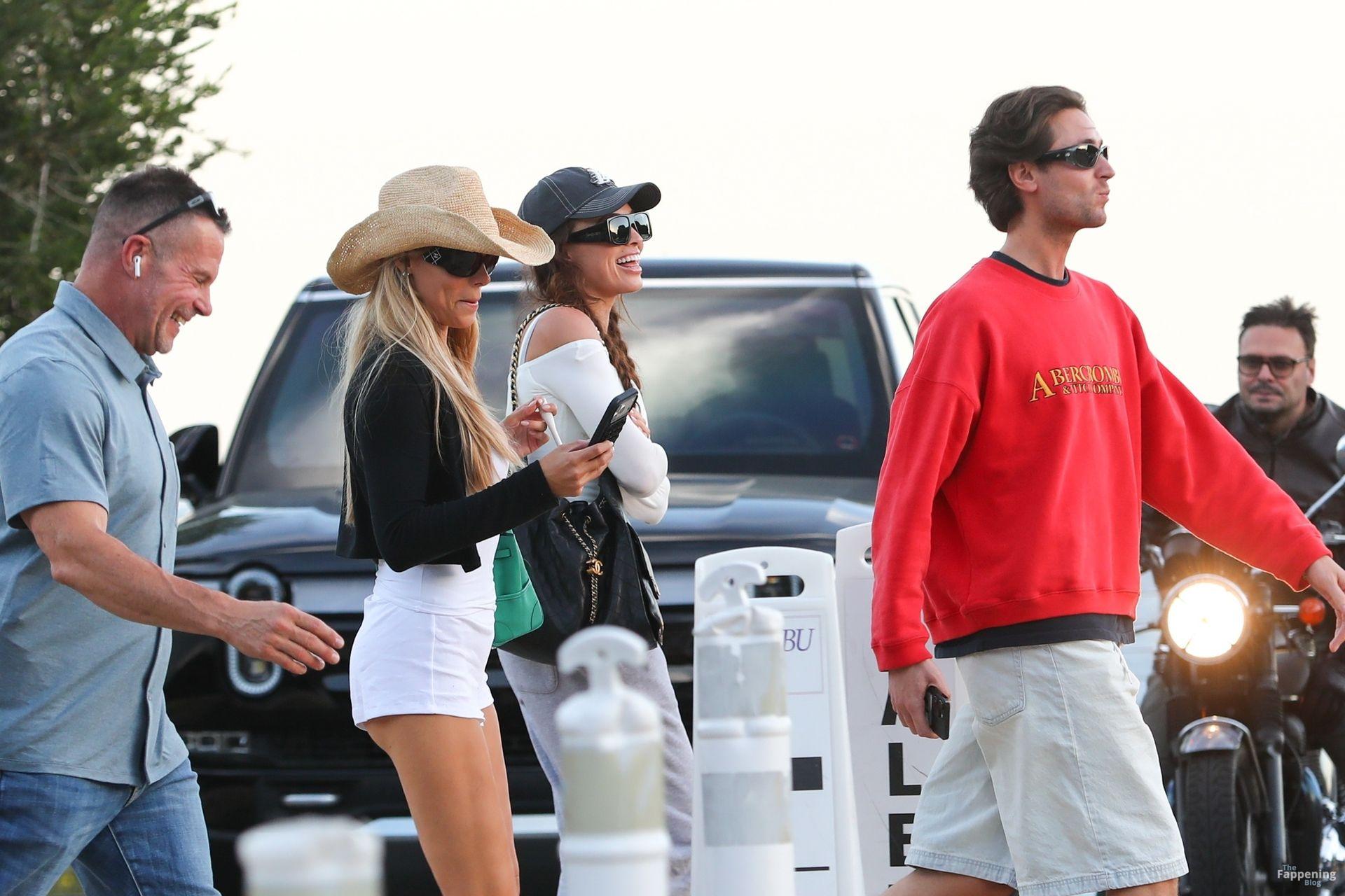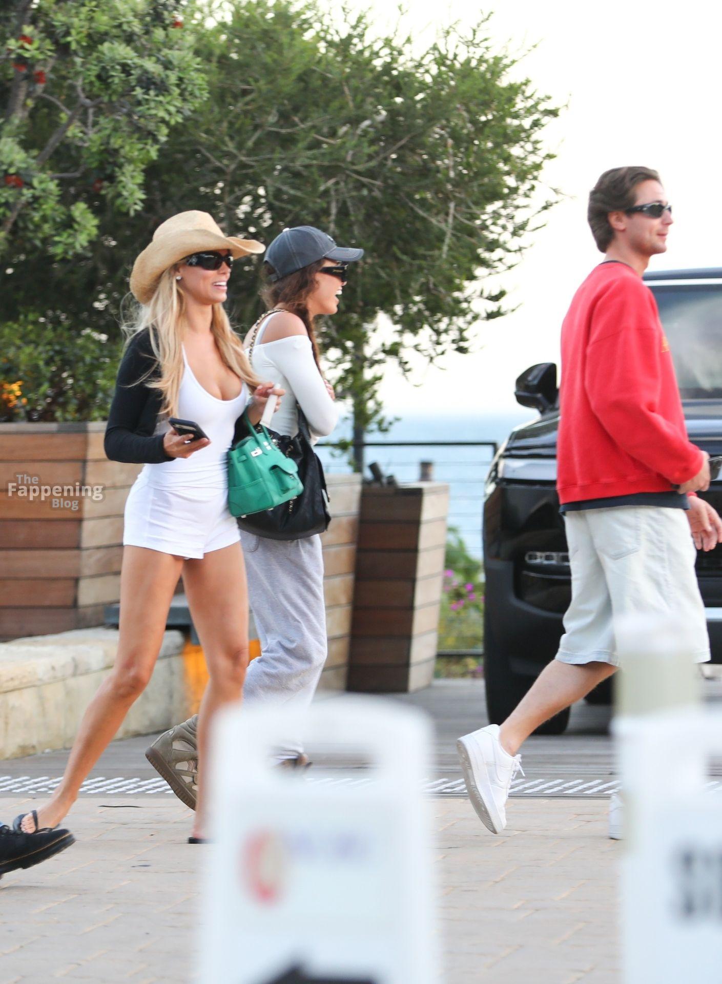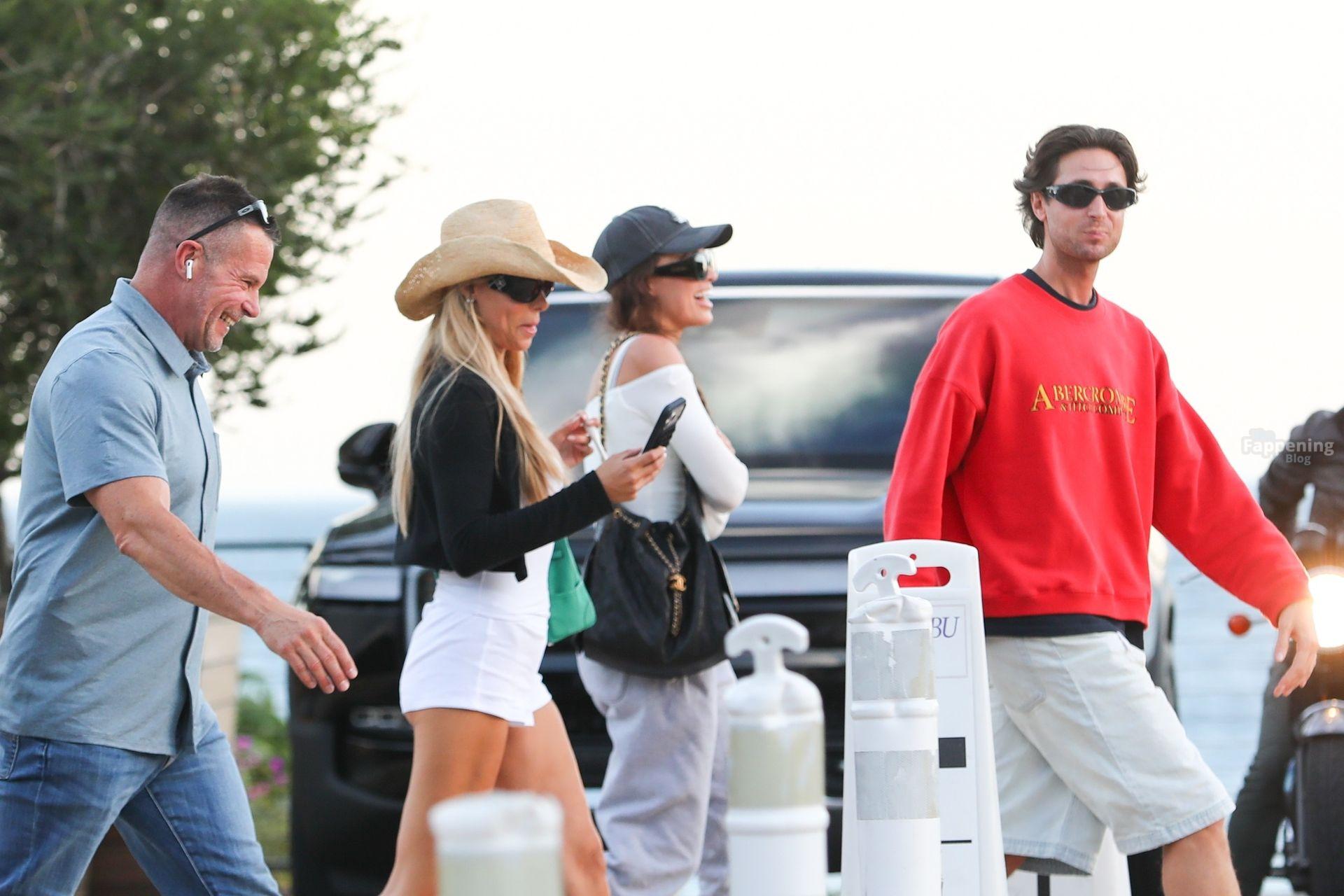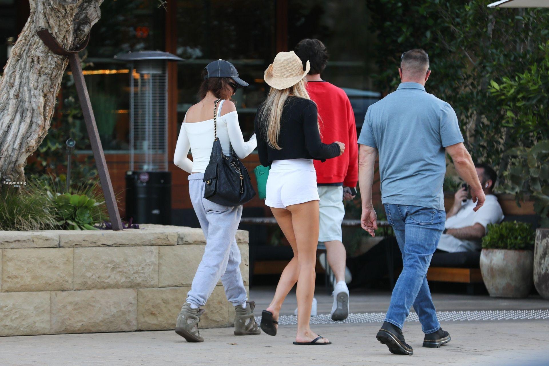 Brooks Nader steps out of Nobu in Malibu in a relaxed outfit, hat, short shorts and flip-flops before heading into Soho House with her sister.