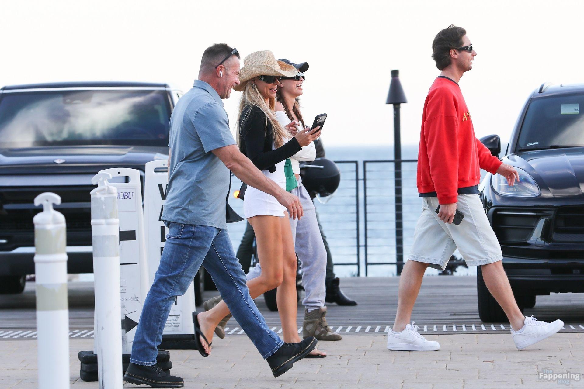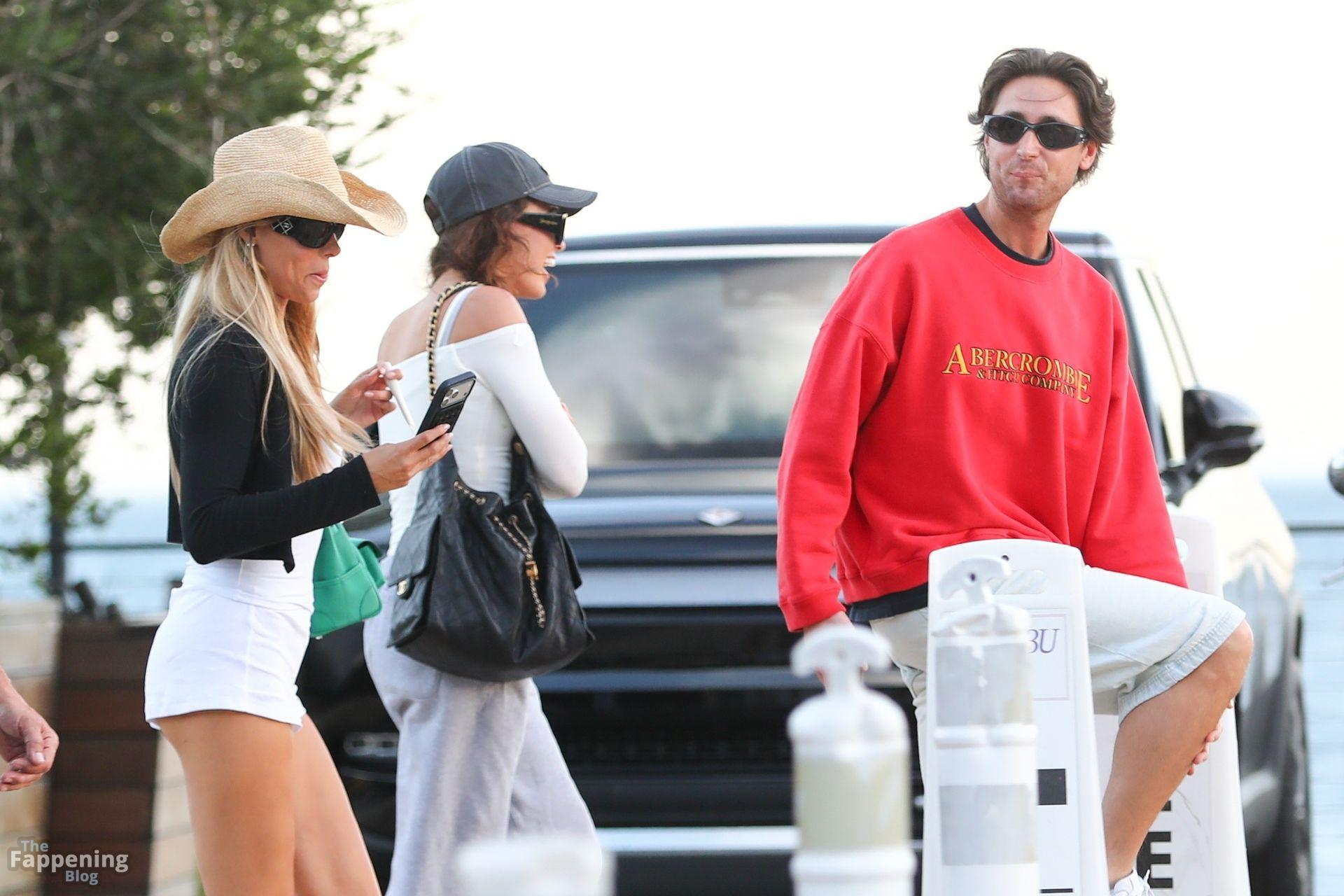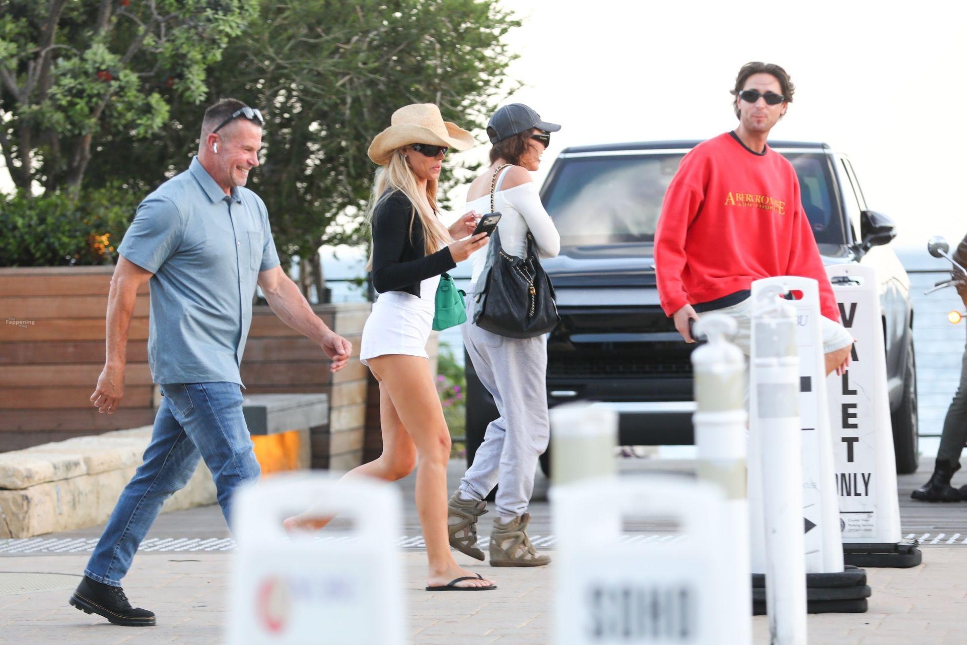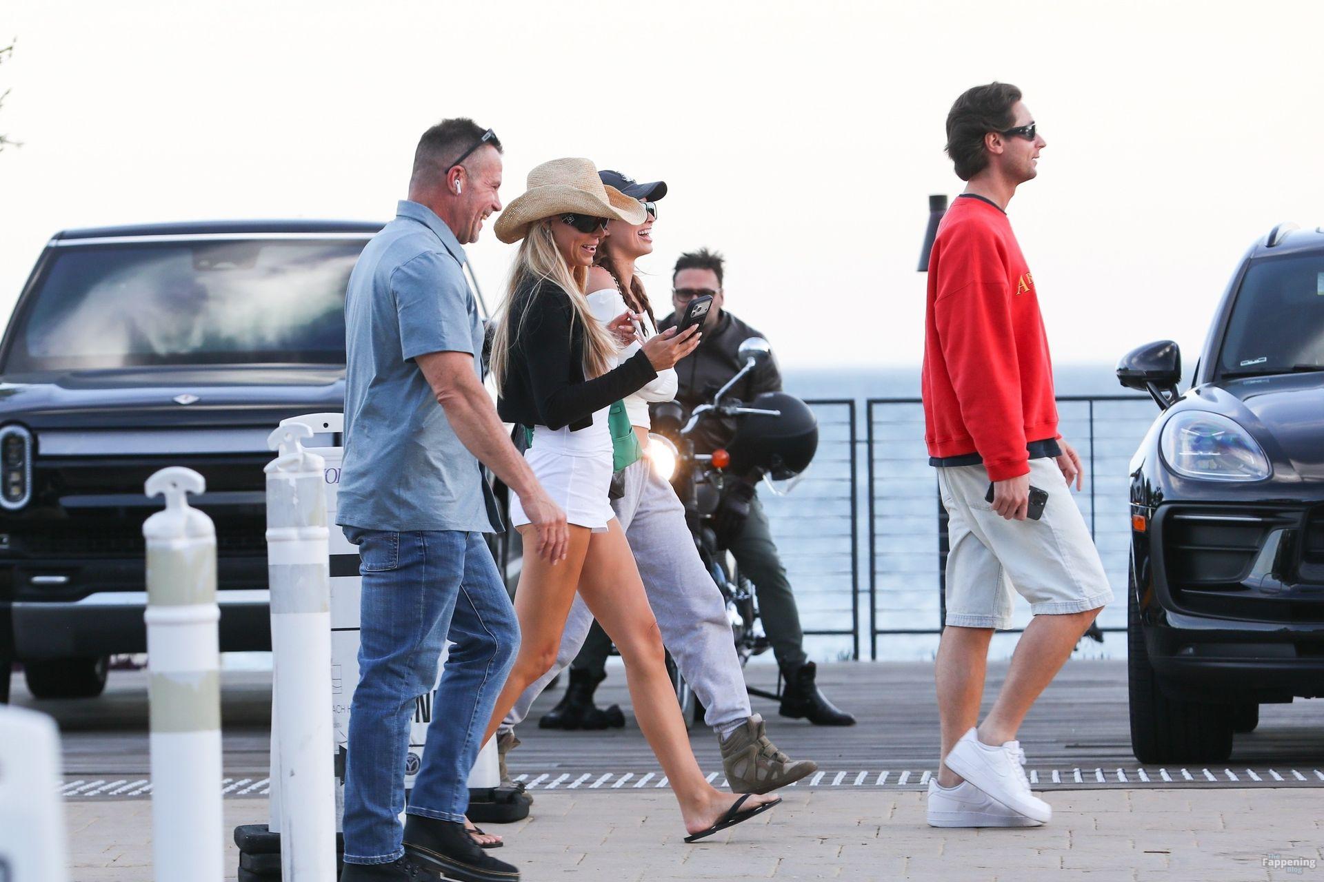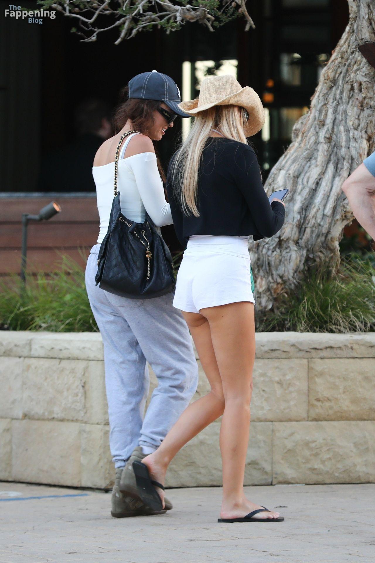 Brooks Nader steps out of Nobu in Malibu in a relaxed outfit, hat, short shorts and flip-flops before heading into Soho House with her sister.