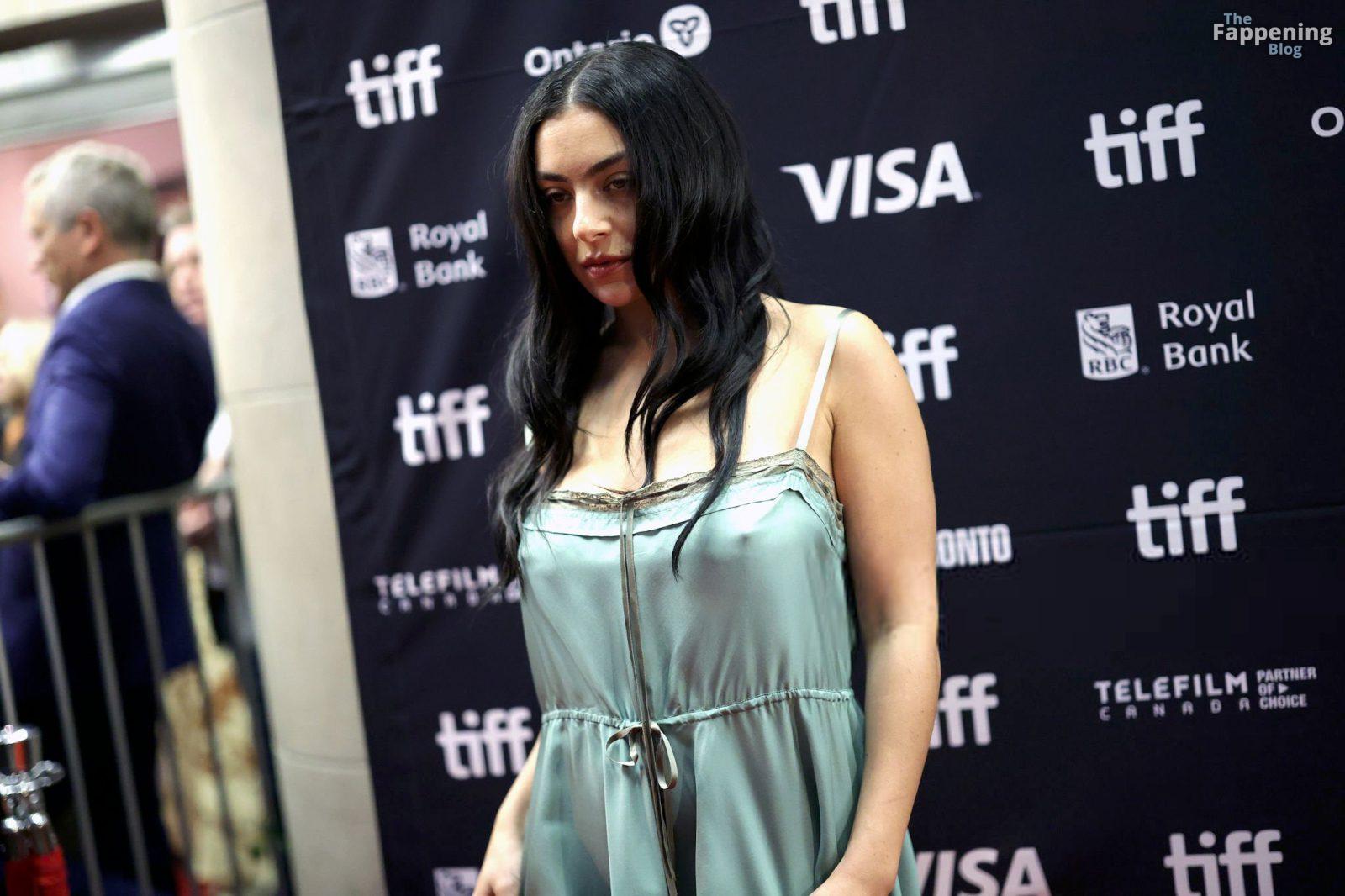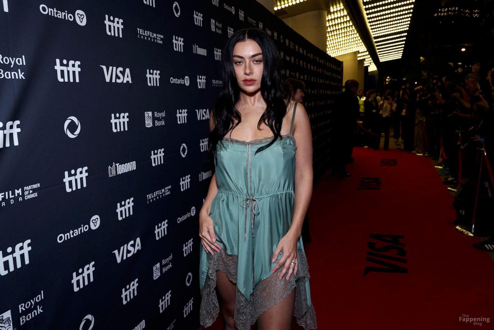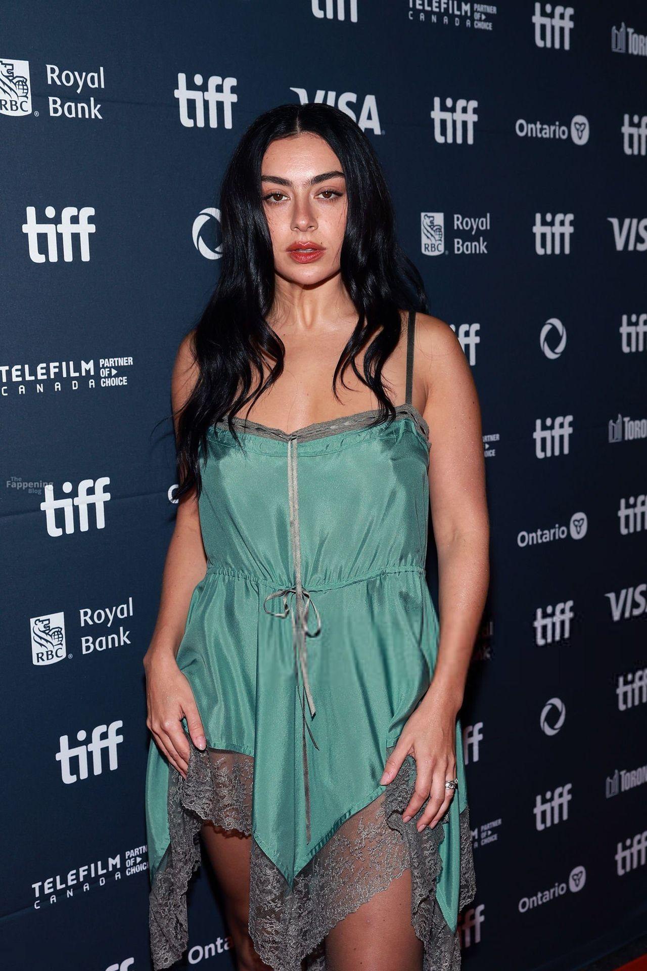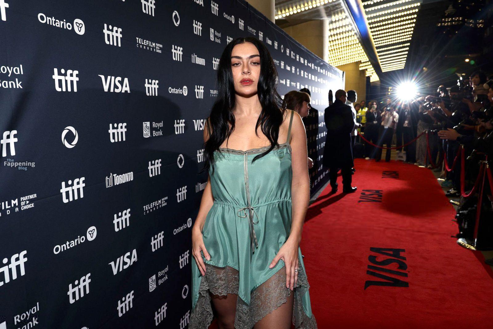 Charli XCX stuns at TIFF in a silky lace slip, flauntin’ cleavage and legs on the “Sacrifice” premiere red carpet.