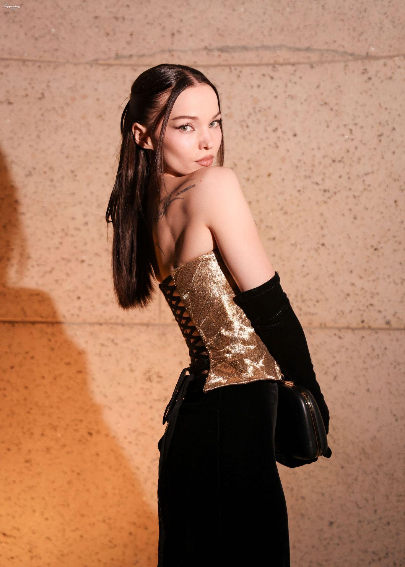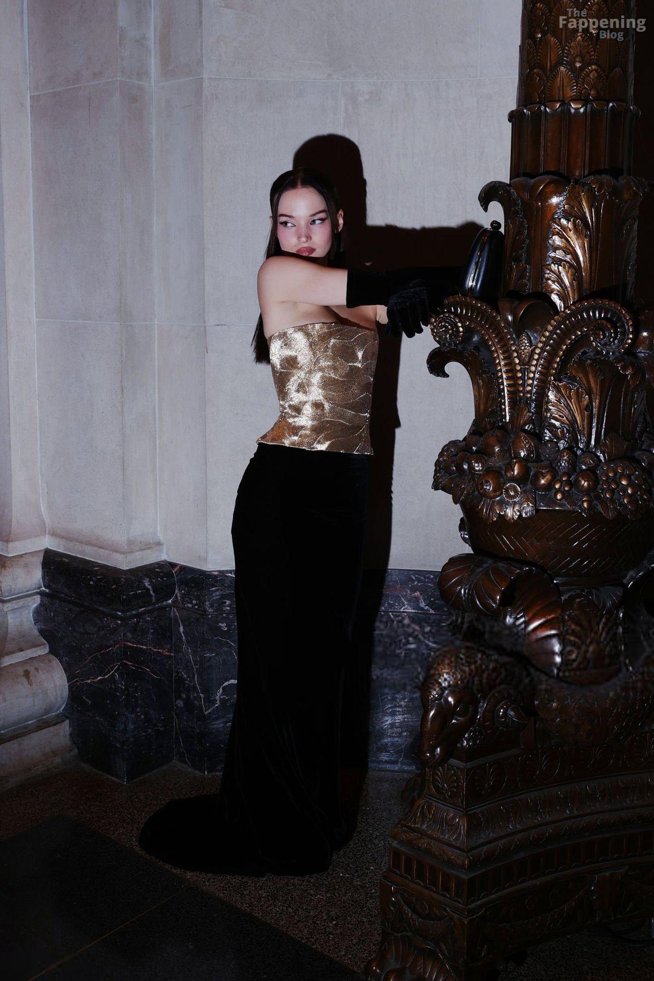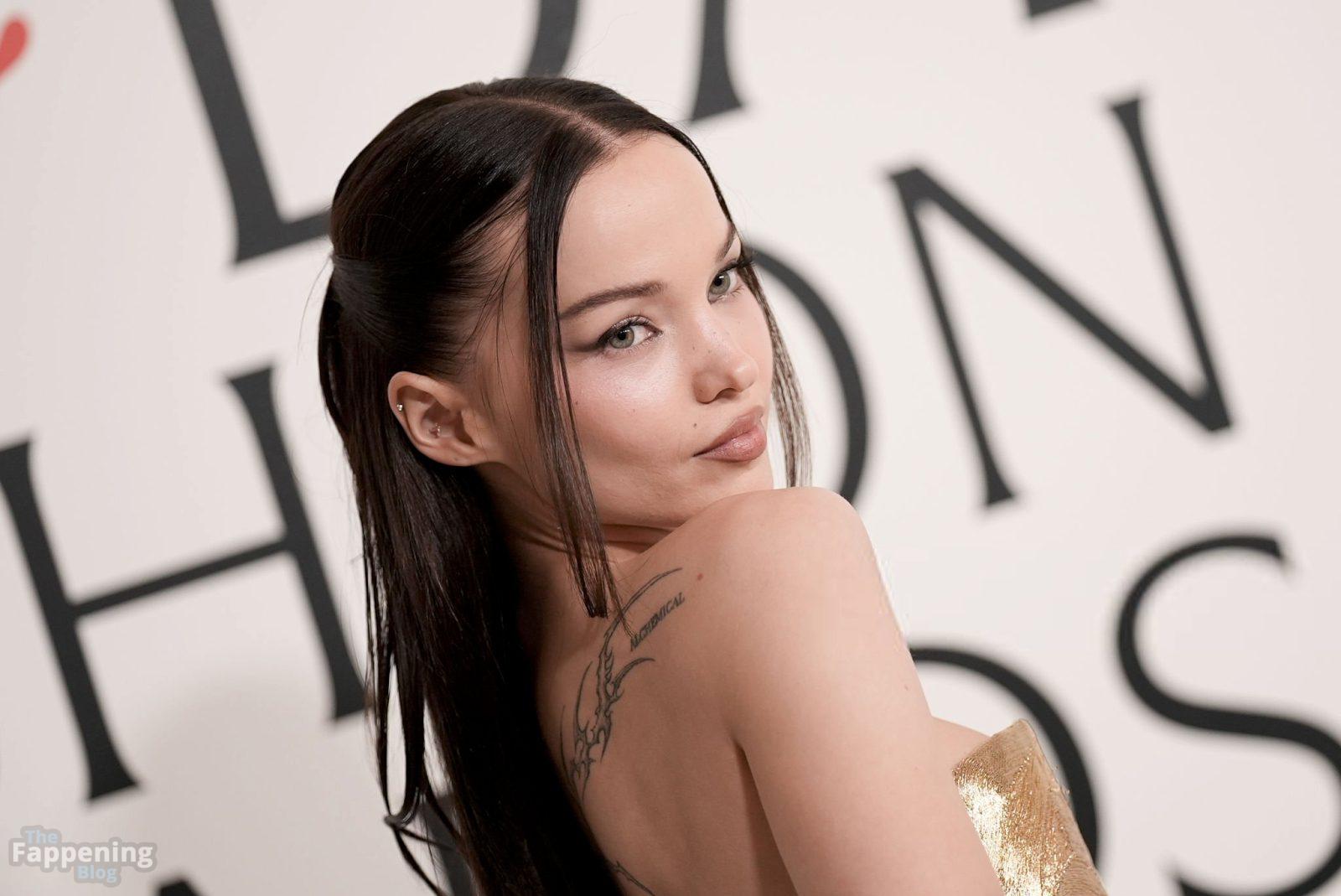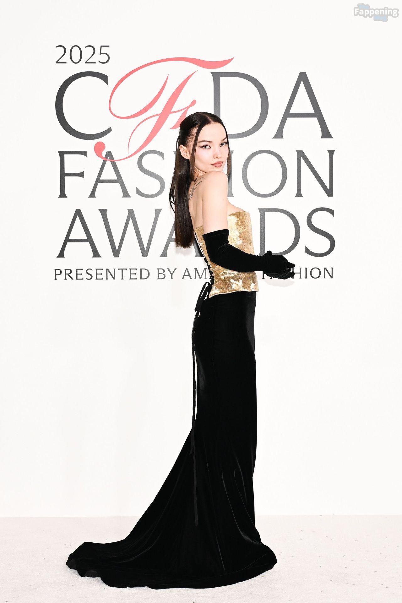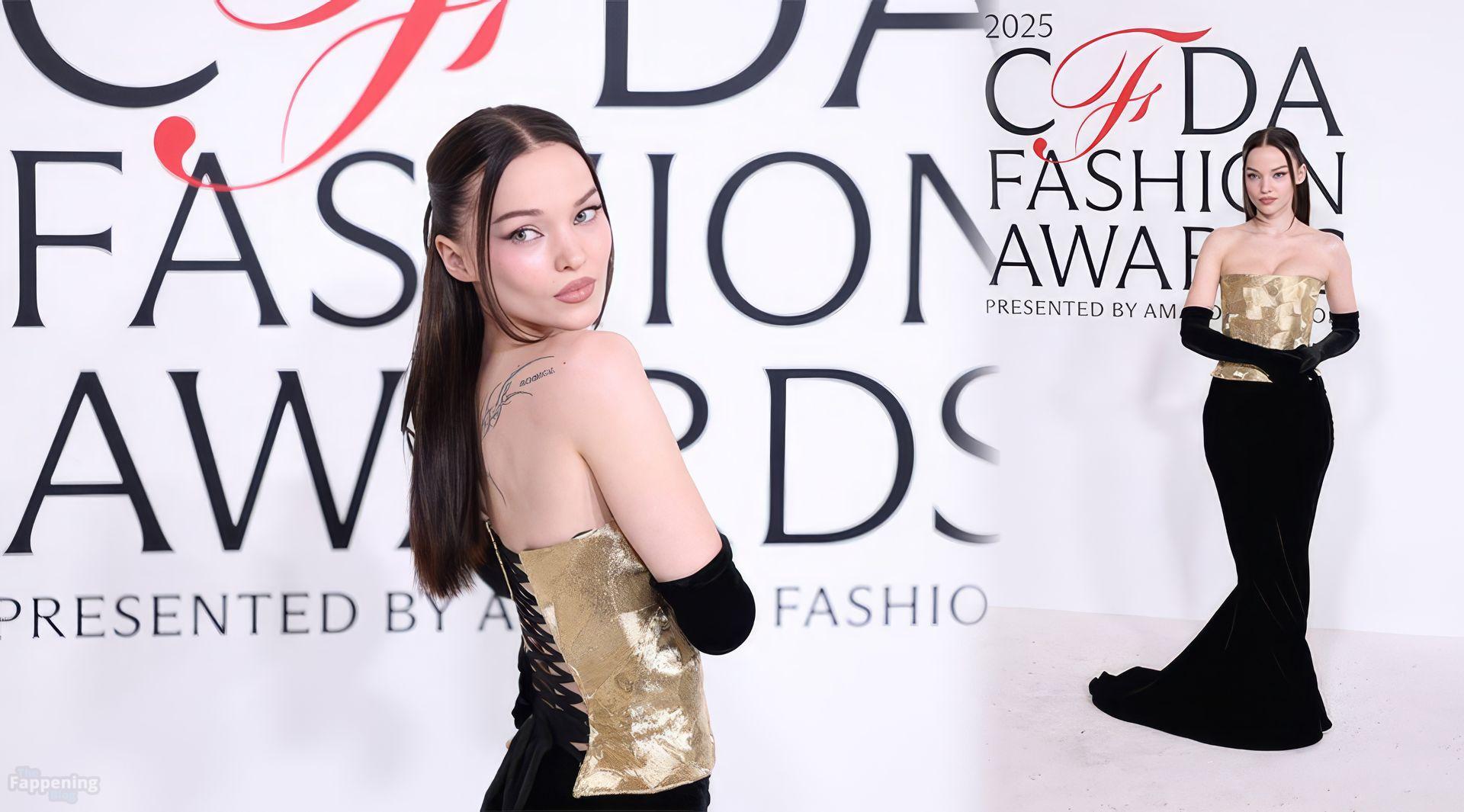 Dove Cameron showed up at the 2025 CFDA Fashion Awards in New York City, rockin’ a strapless gold Marc Jacobs gown with a corset bodice and black gloves. She posed on the red carpet at the American Museum of Natural History.