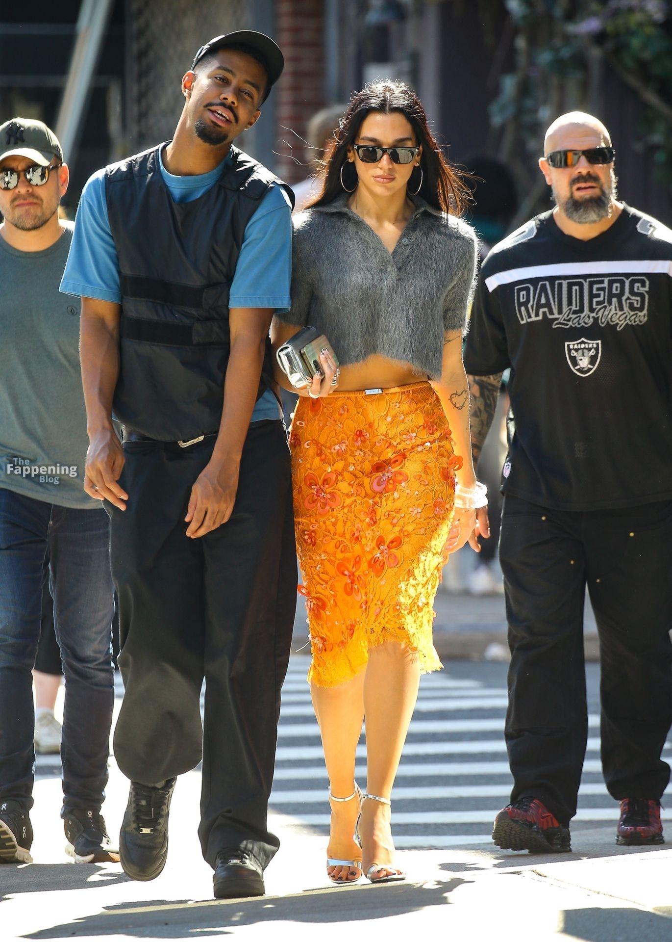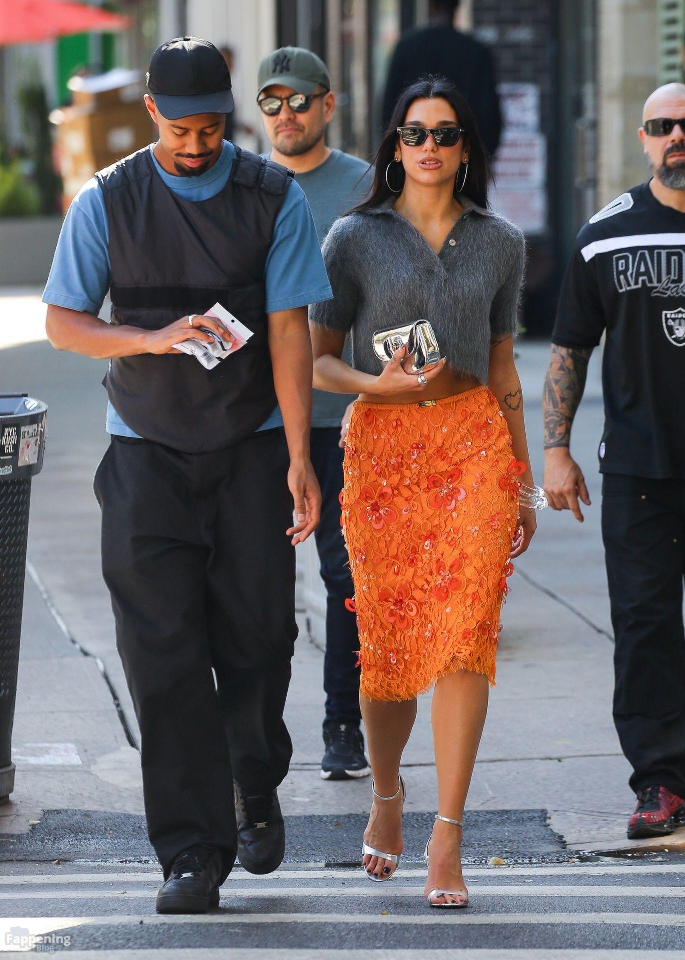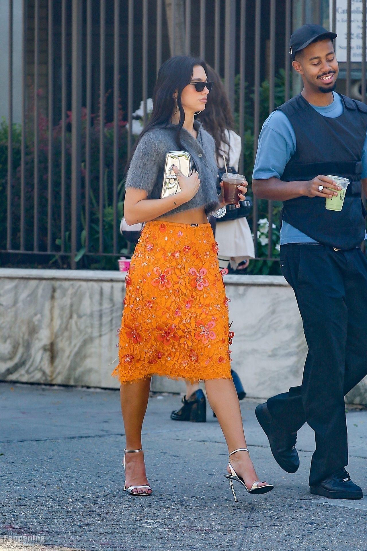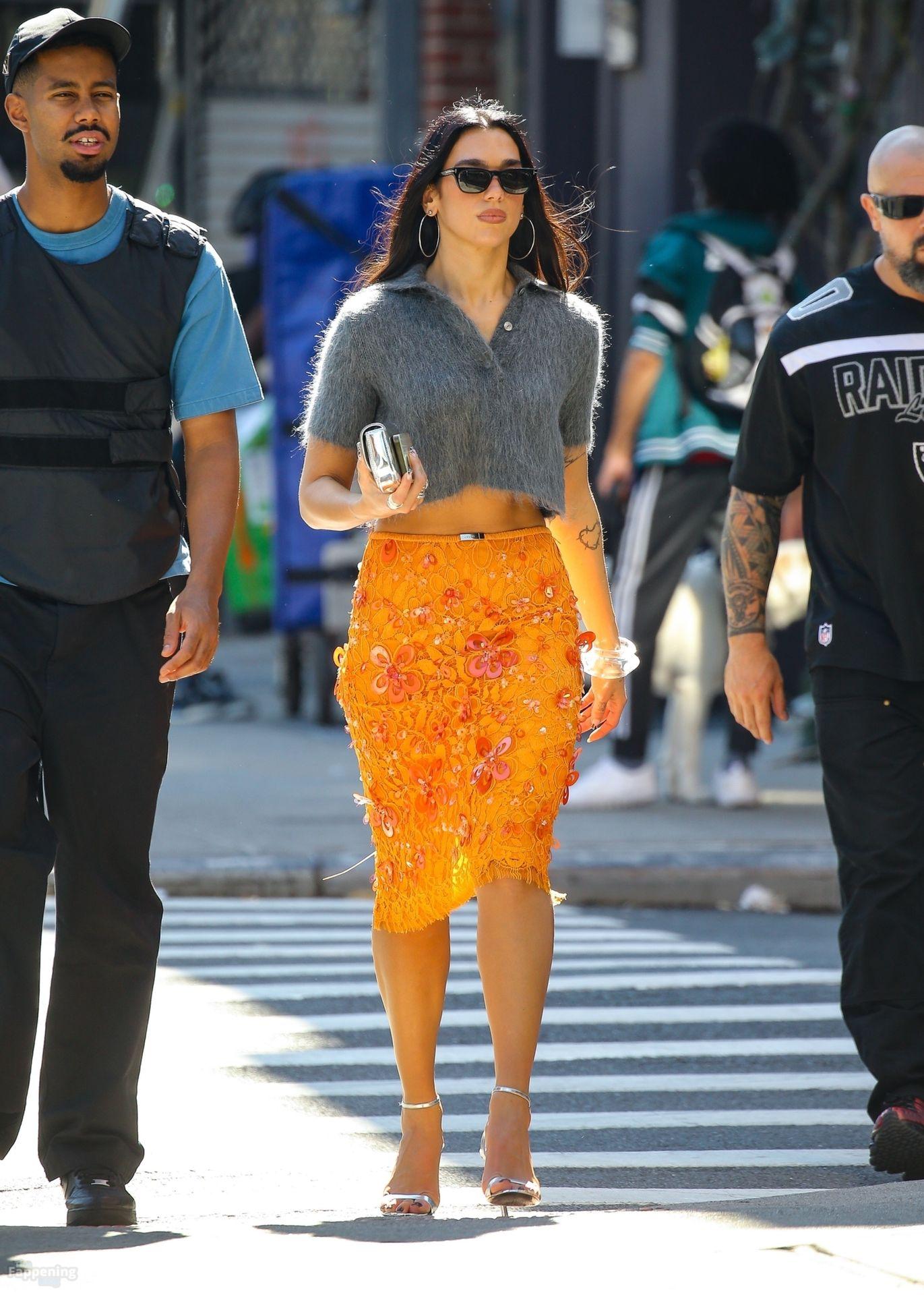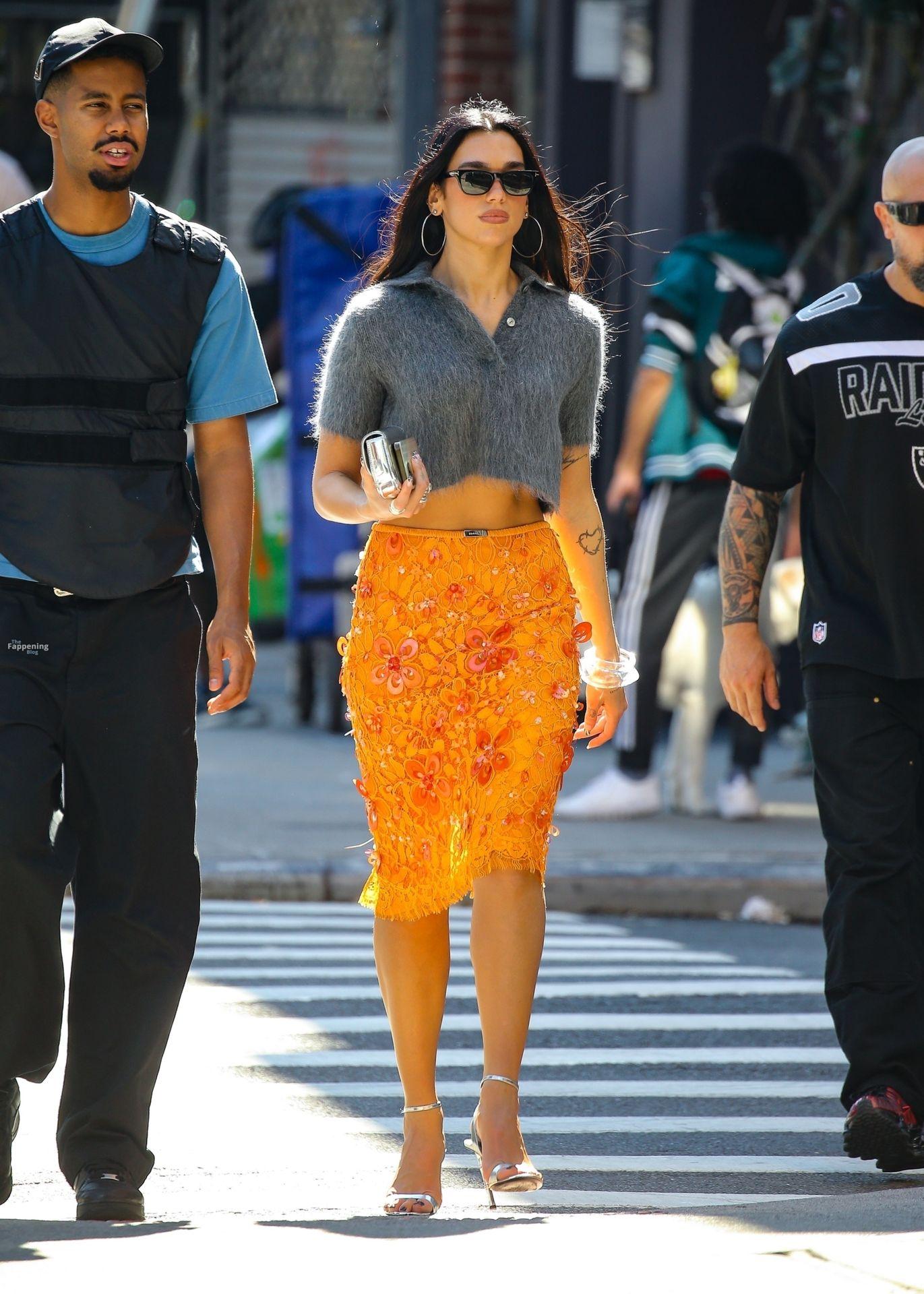 Singer Dua Lipa lookin’ mad stylish rockin’ an orange Gucci floral long skirt, a mini fur grey shirt, silver heels, a silver mini purse, a clear bracelet, and shades while strollin’ through New York.