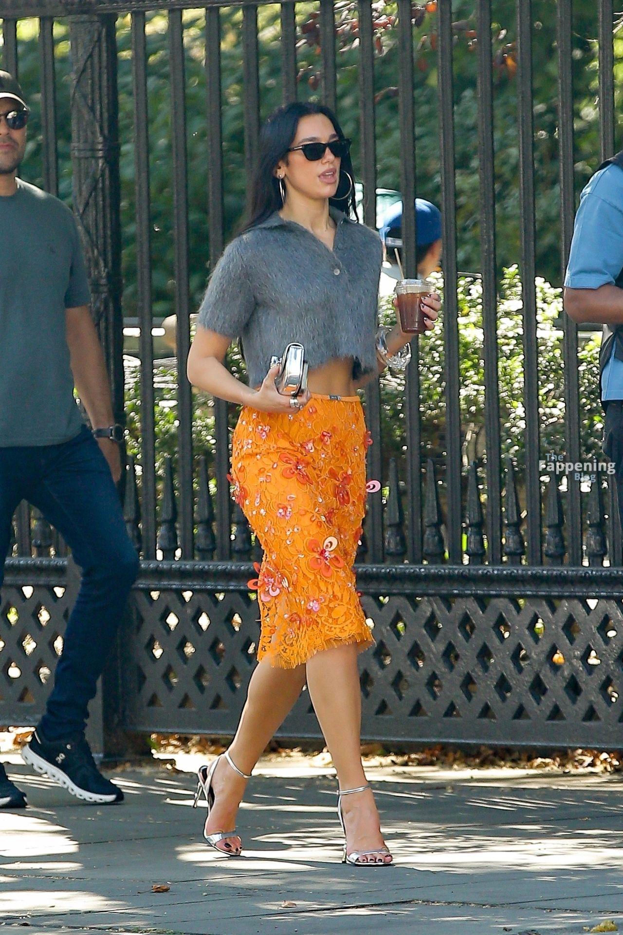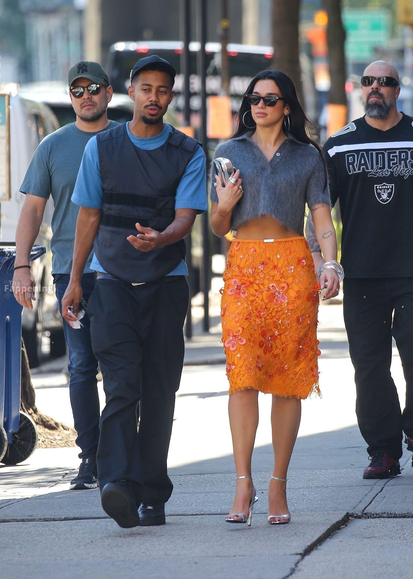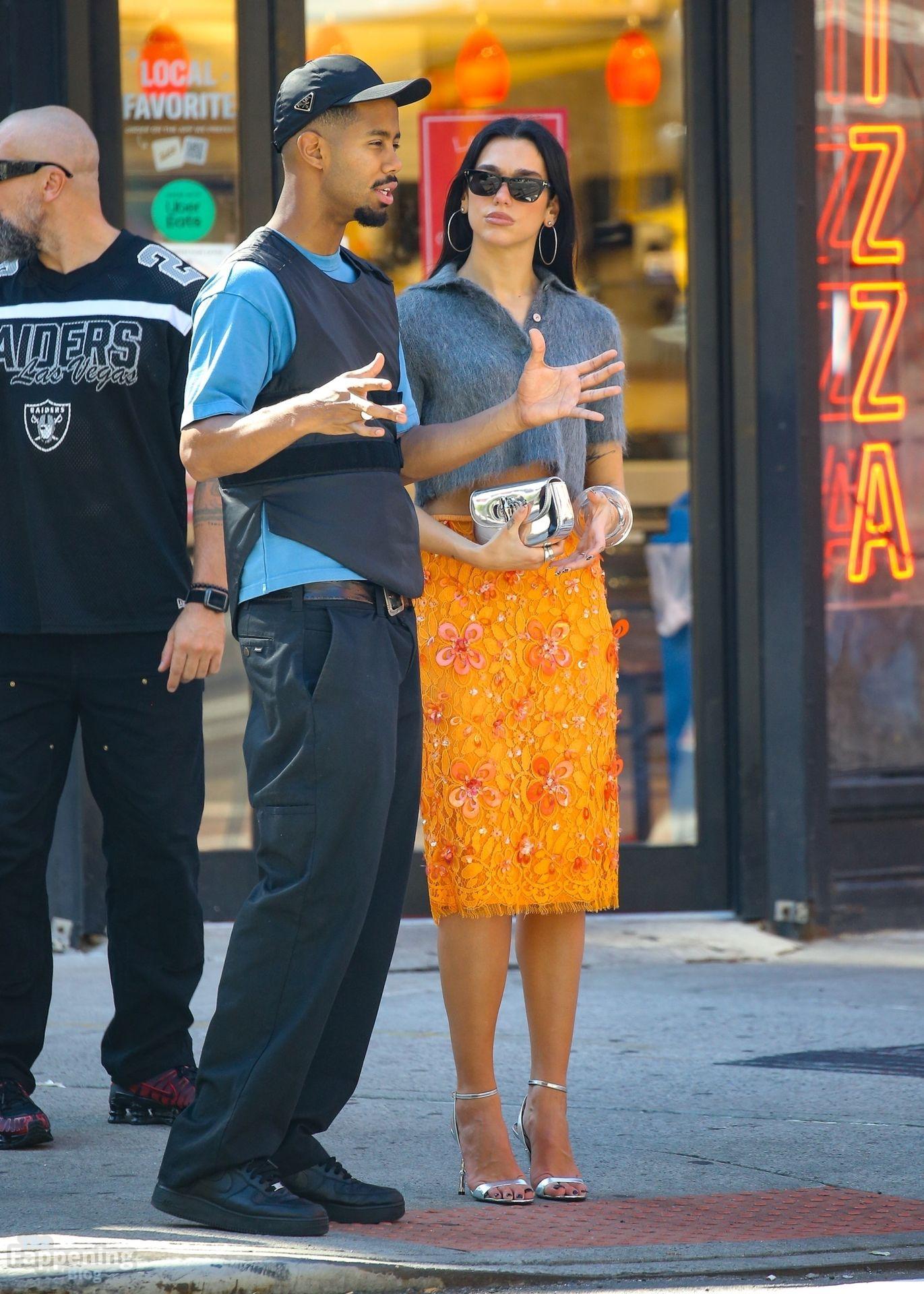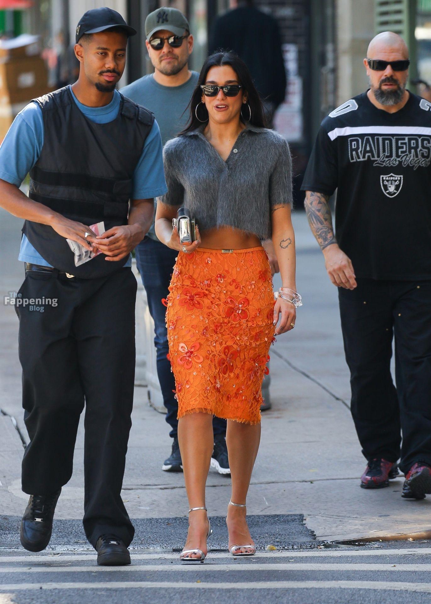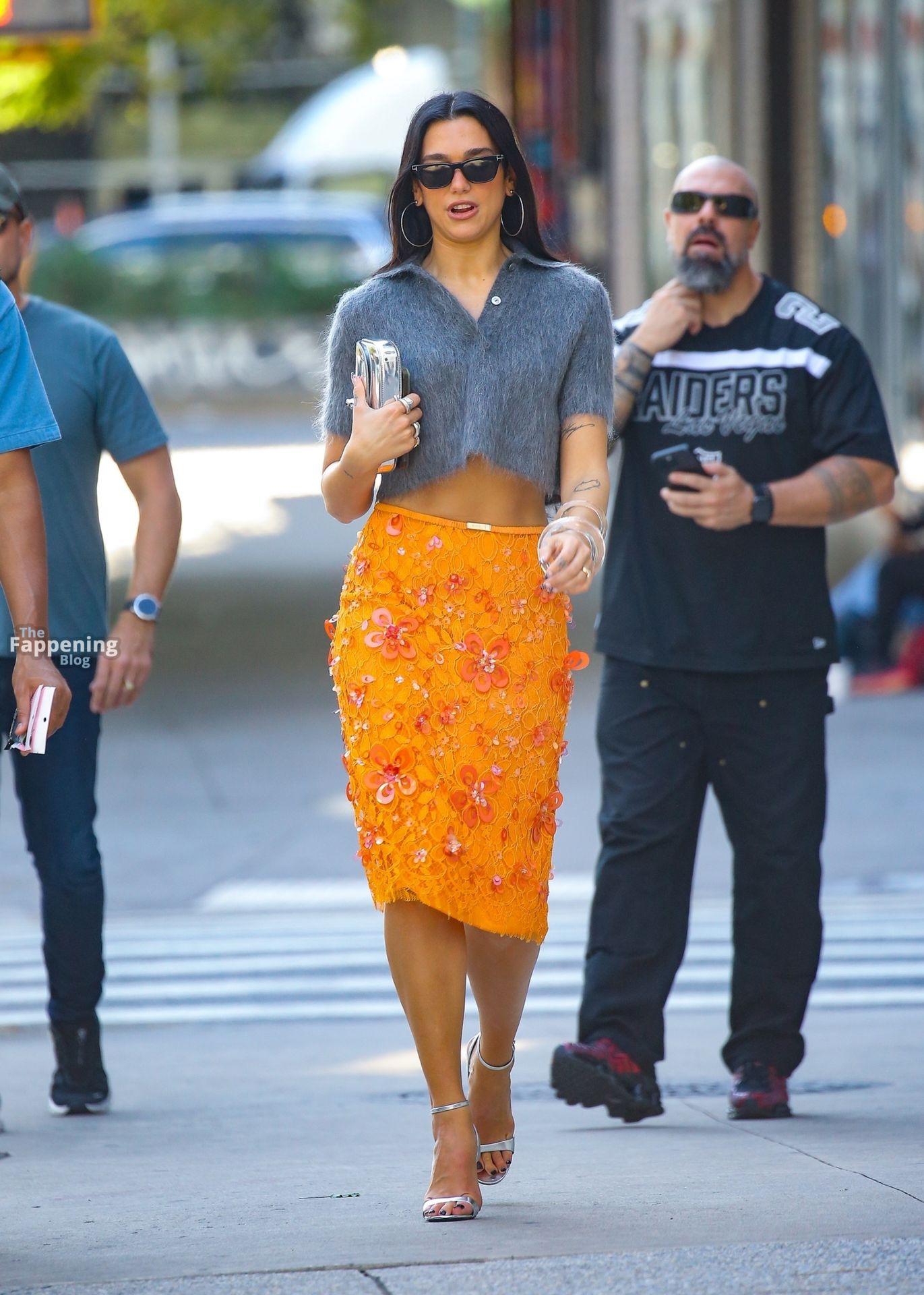 Singer Dua Lipa lookin’ mad stylish rockin’ an orange Gucci floral long skirt, a mini fur grey shirt, silver heels, a silver mini purse, a clear bracelet, and shades while strollin’ through New York.
