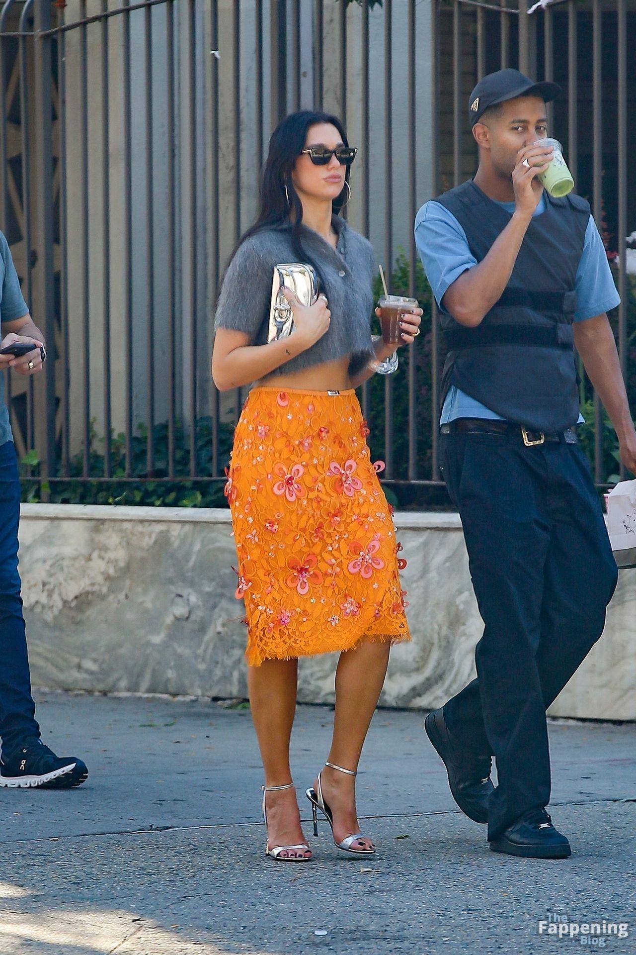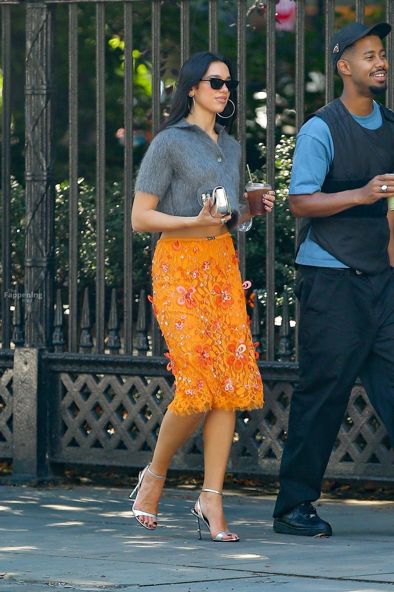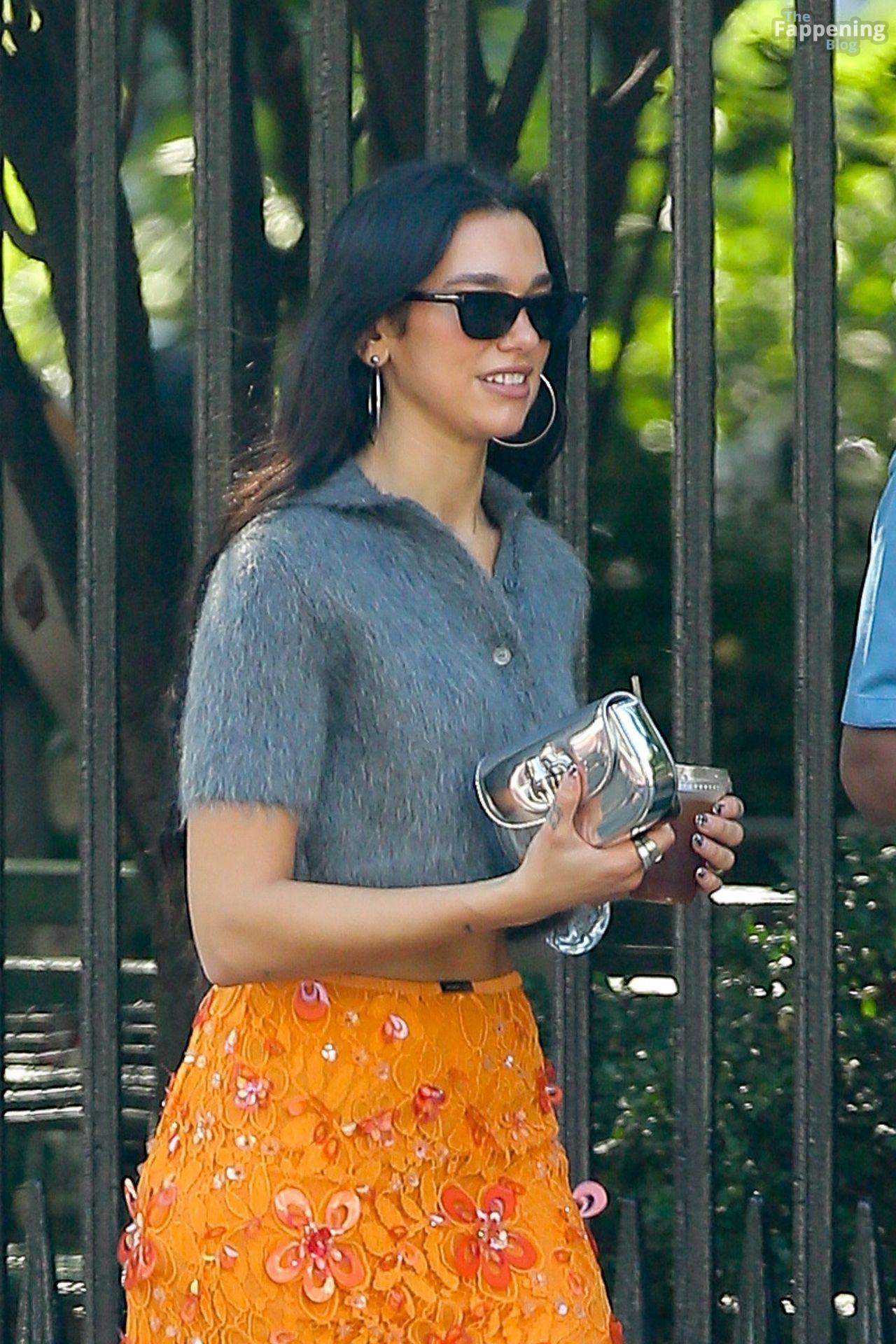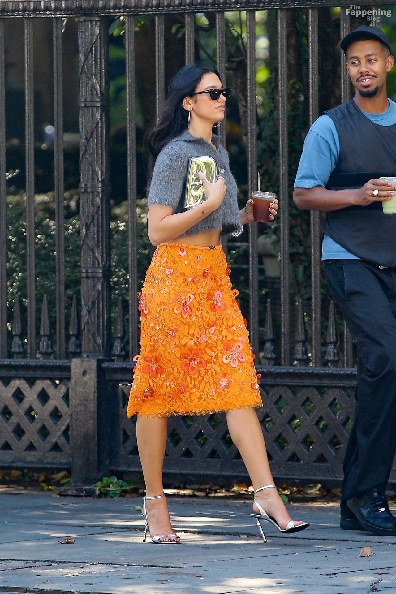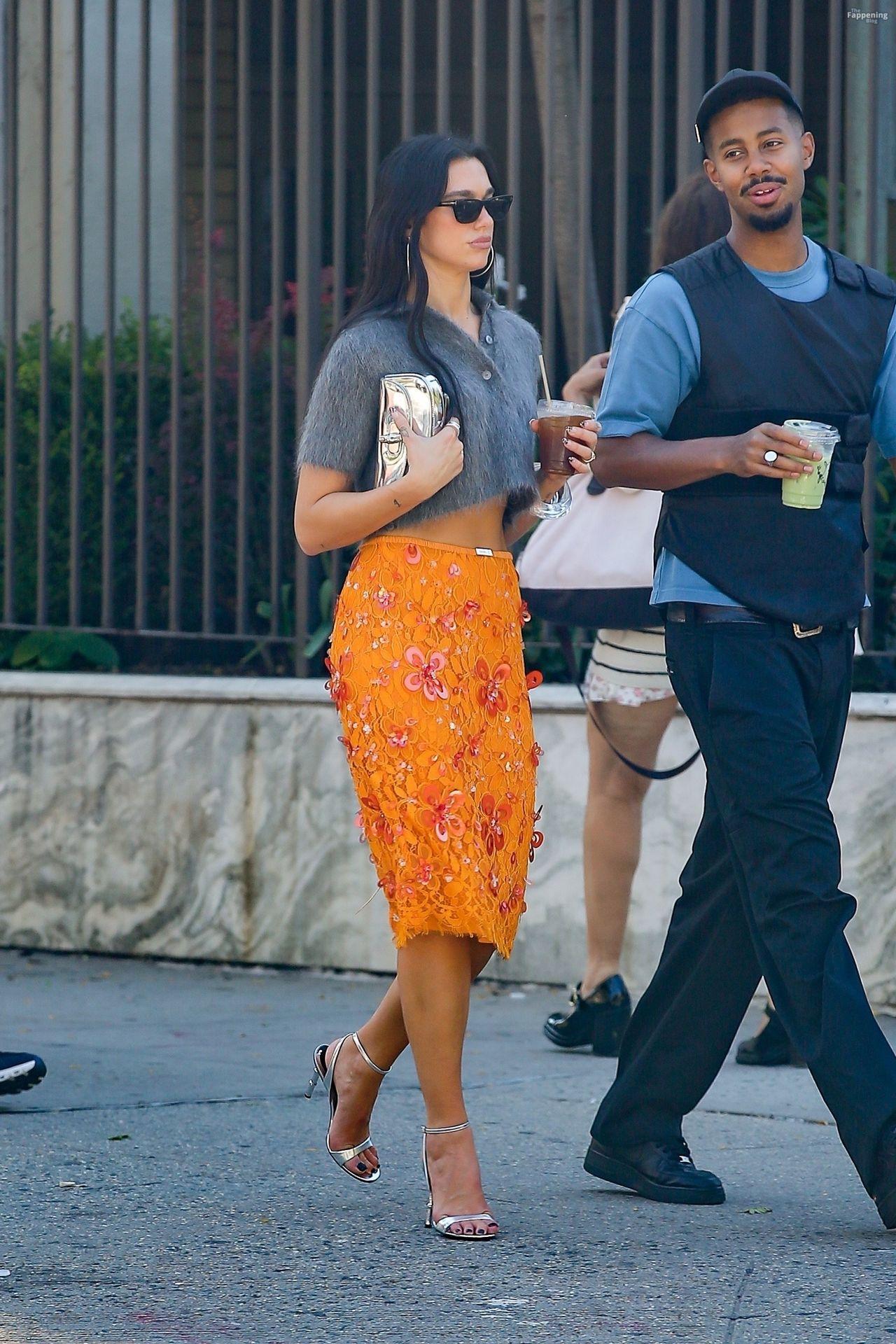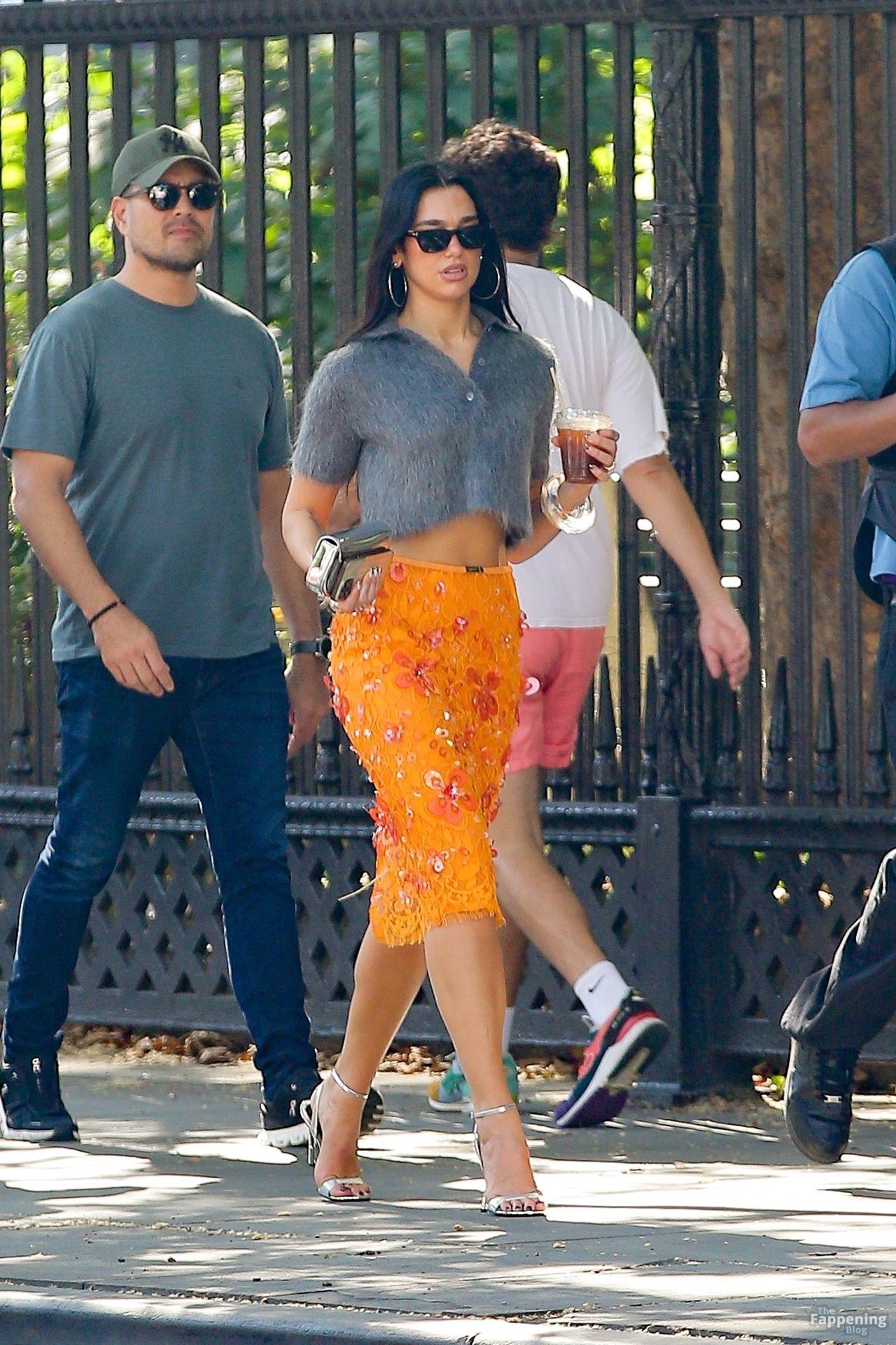 Singer Dua Lipa lookin’ mad stylish rockin’ an orange Gucci floral long skirt, a mini fur grey shirt, silver heels, a silver mini purse, a clear bracelet, and shades while strollin’ through New York.
