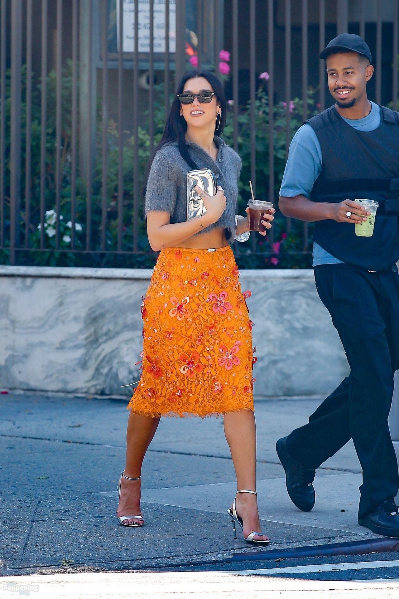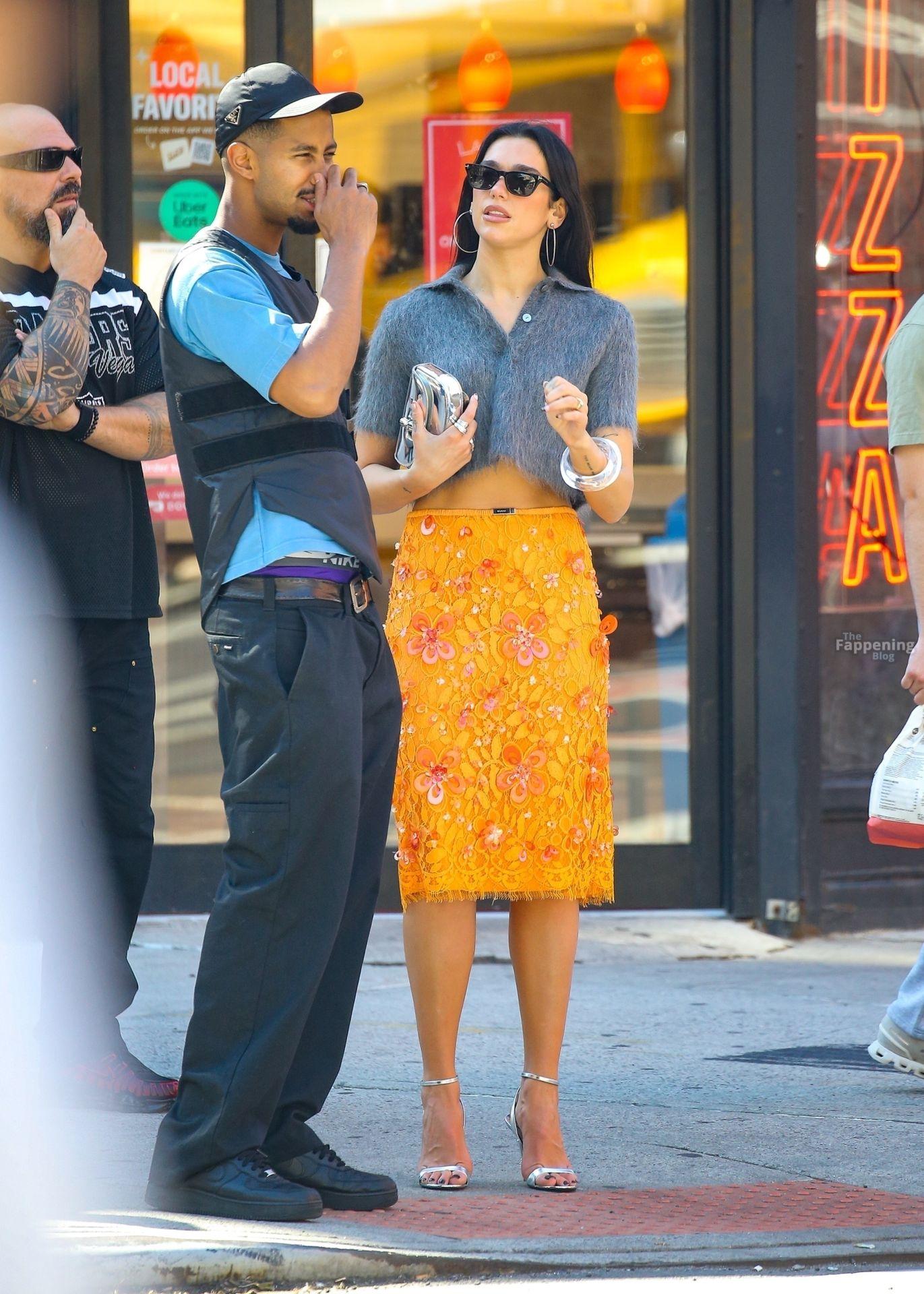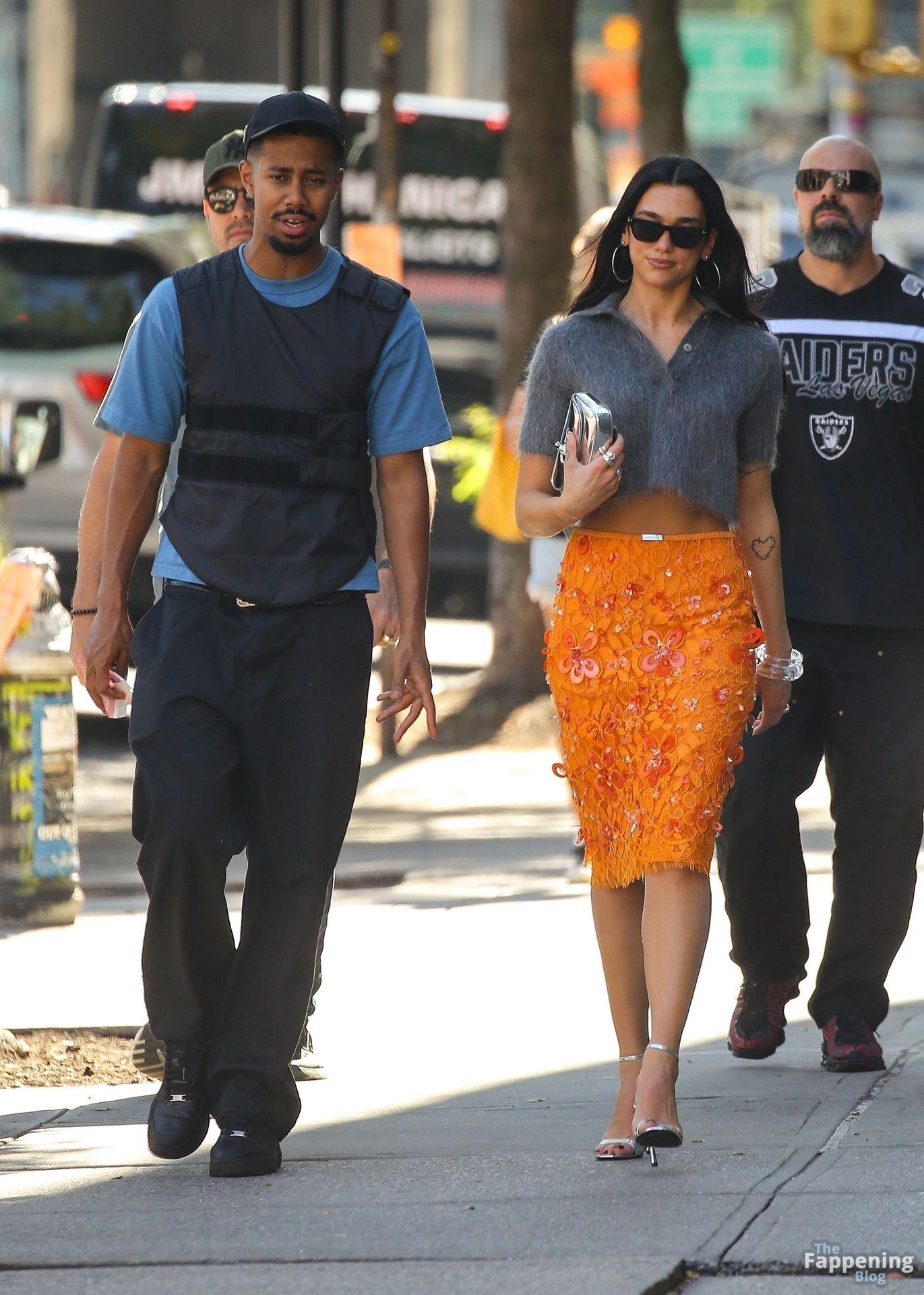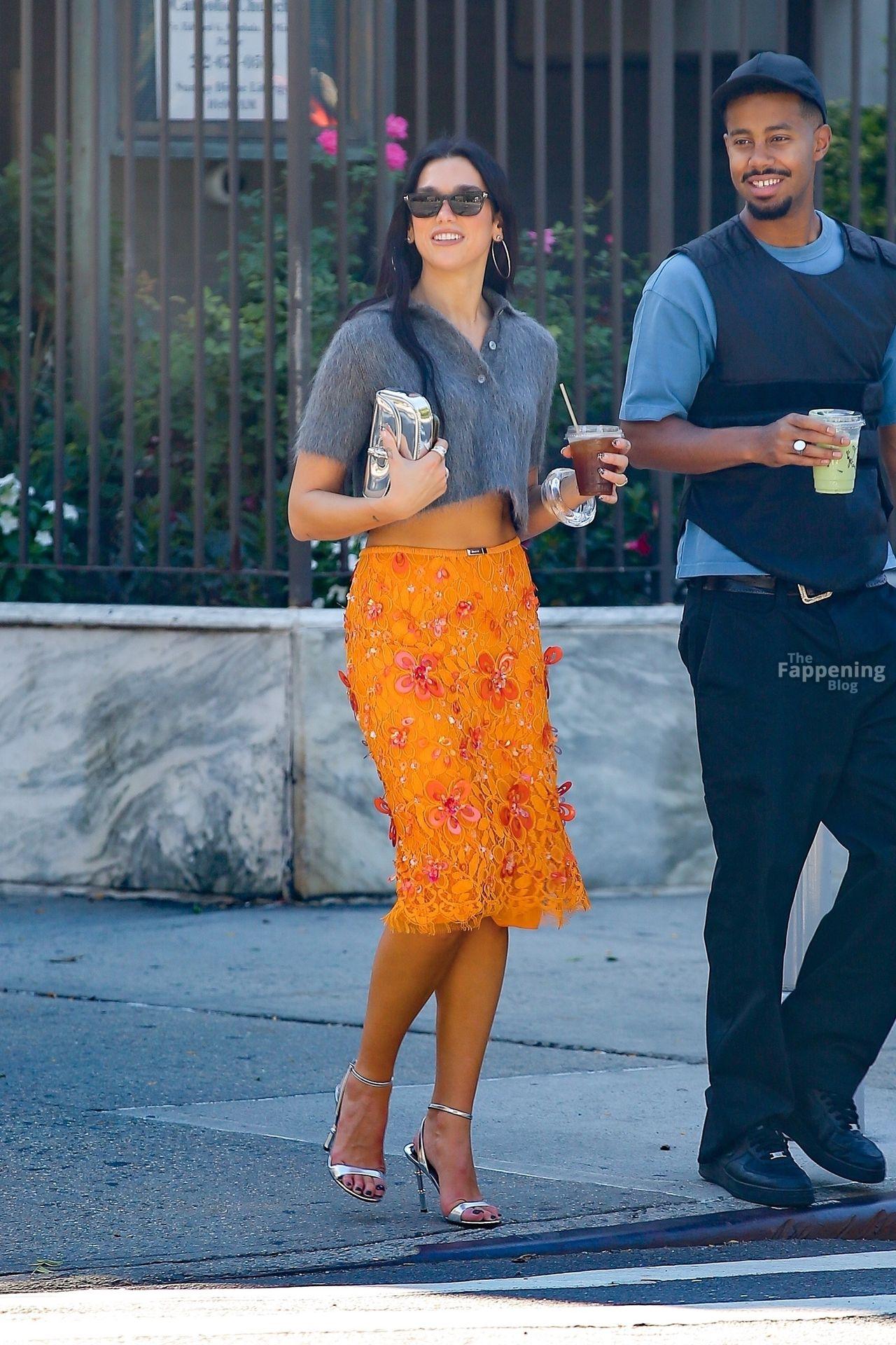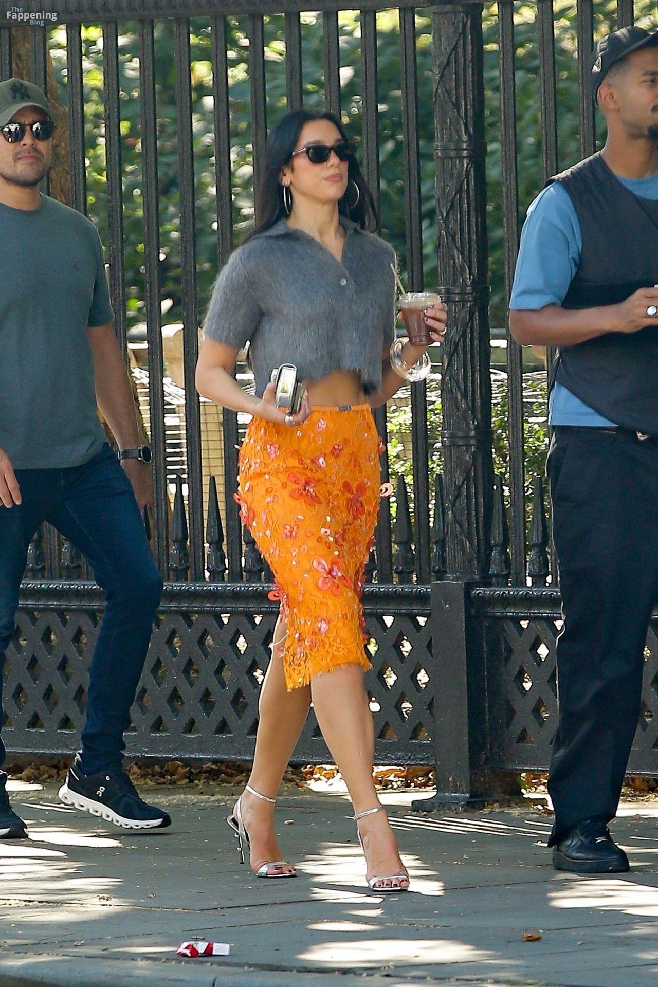 Singer Dua Lipa lookin’ mad stylish rockin’ an orange Gucci floral long skirt, a mini fur grey shirt, silver heels, a silver mini purse, a clear bracelet, and shades while strollin’ through New York.