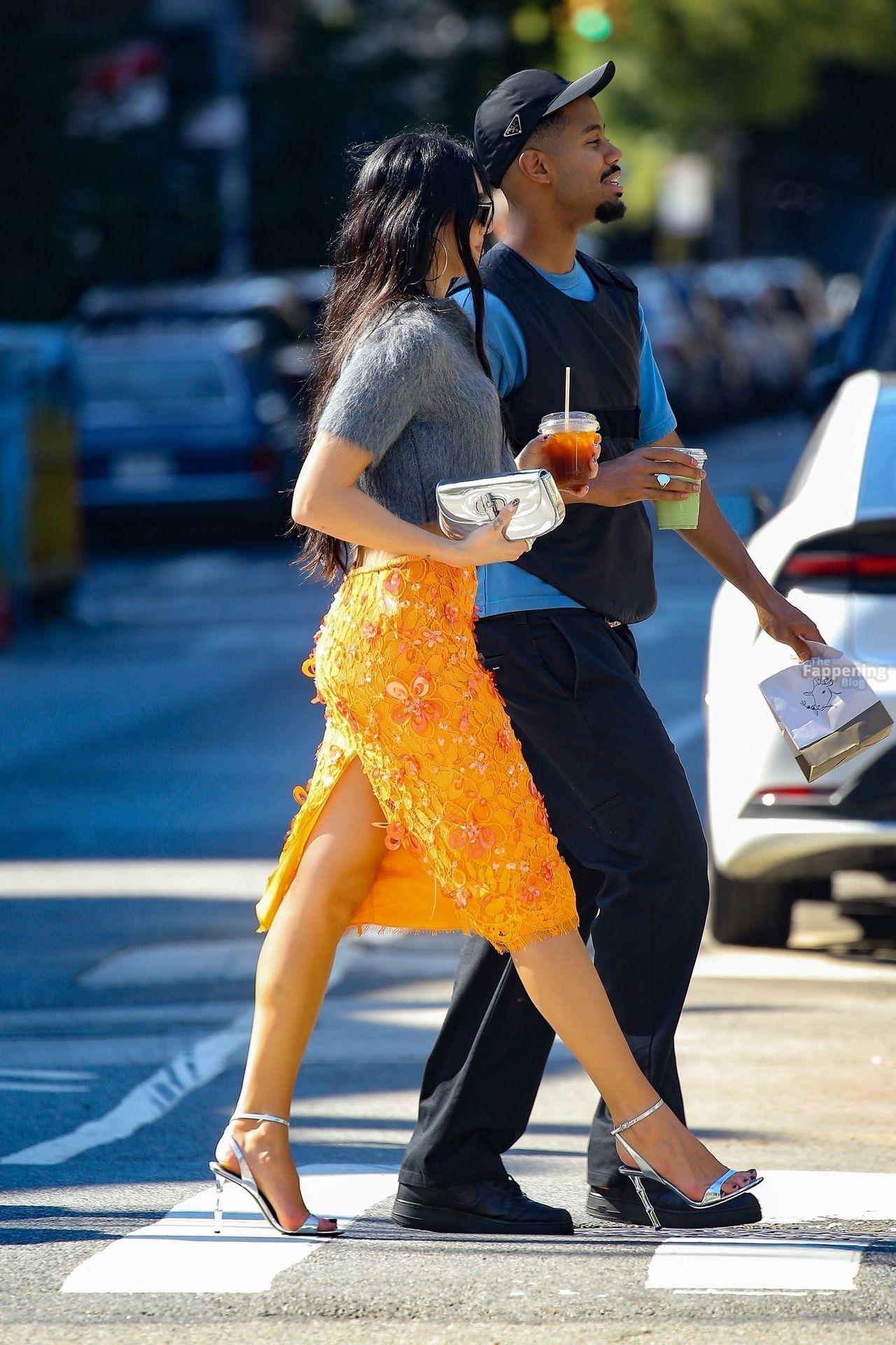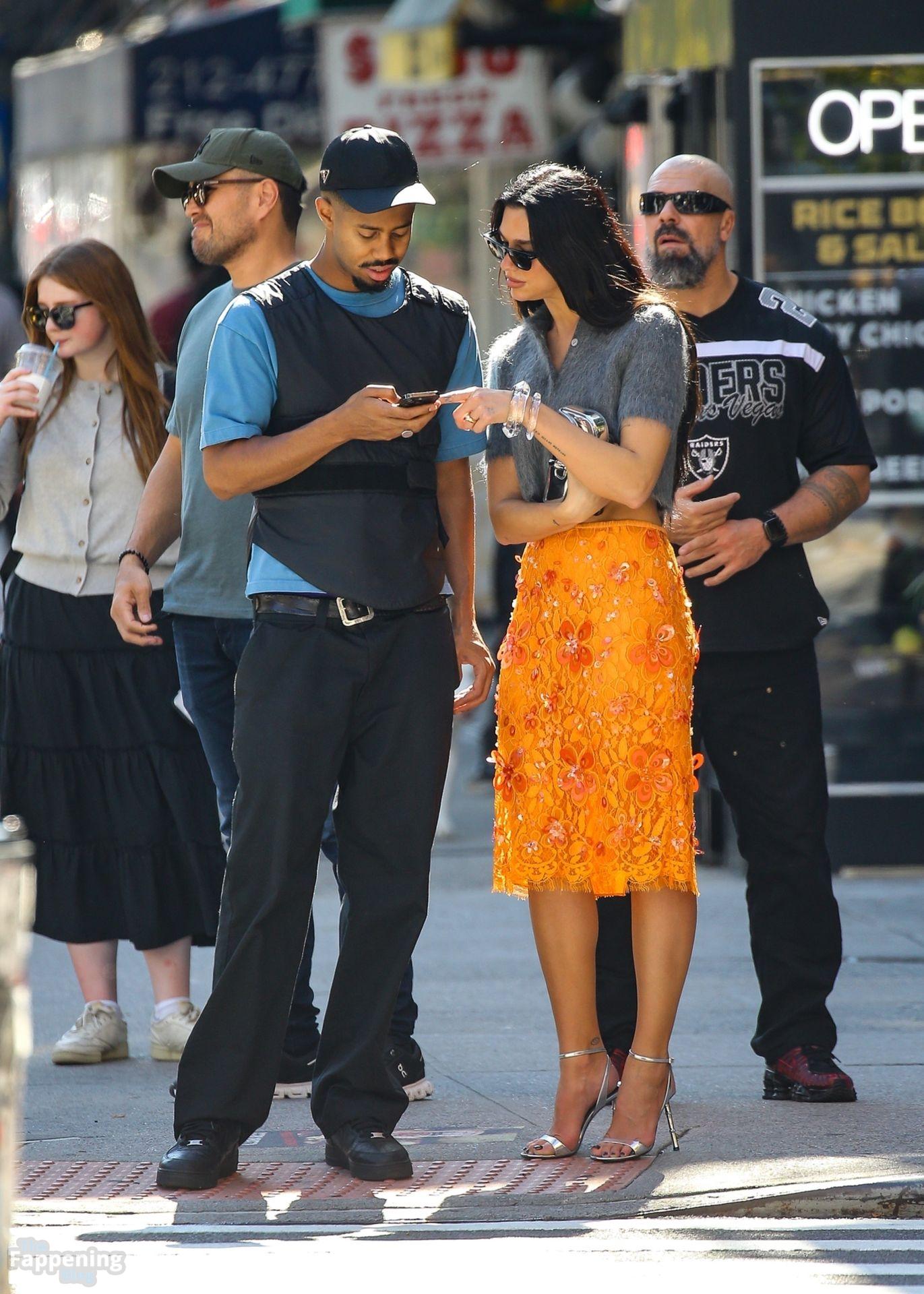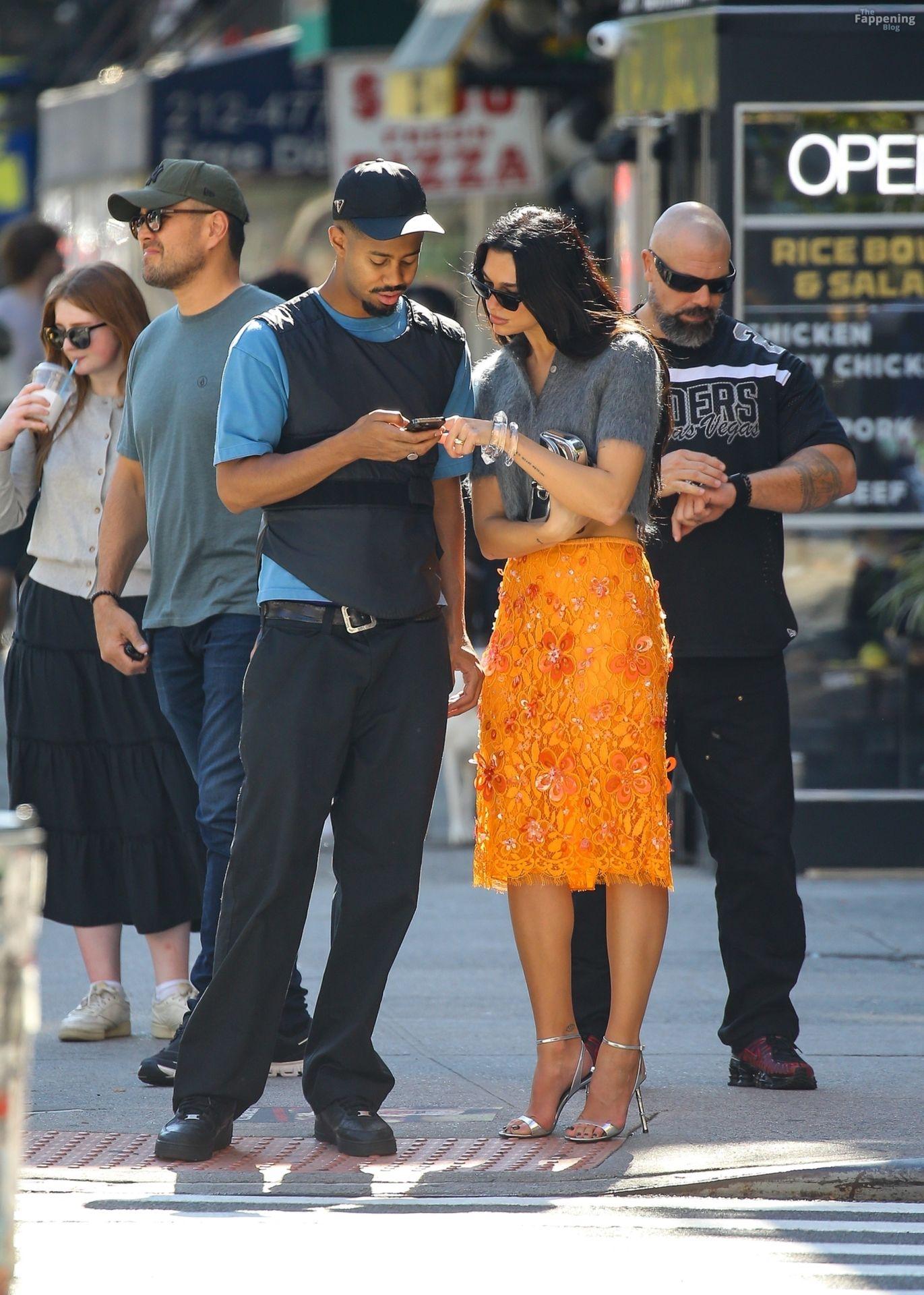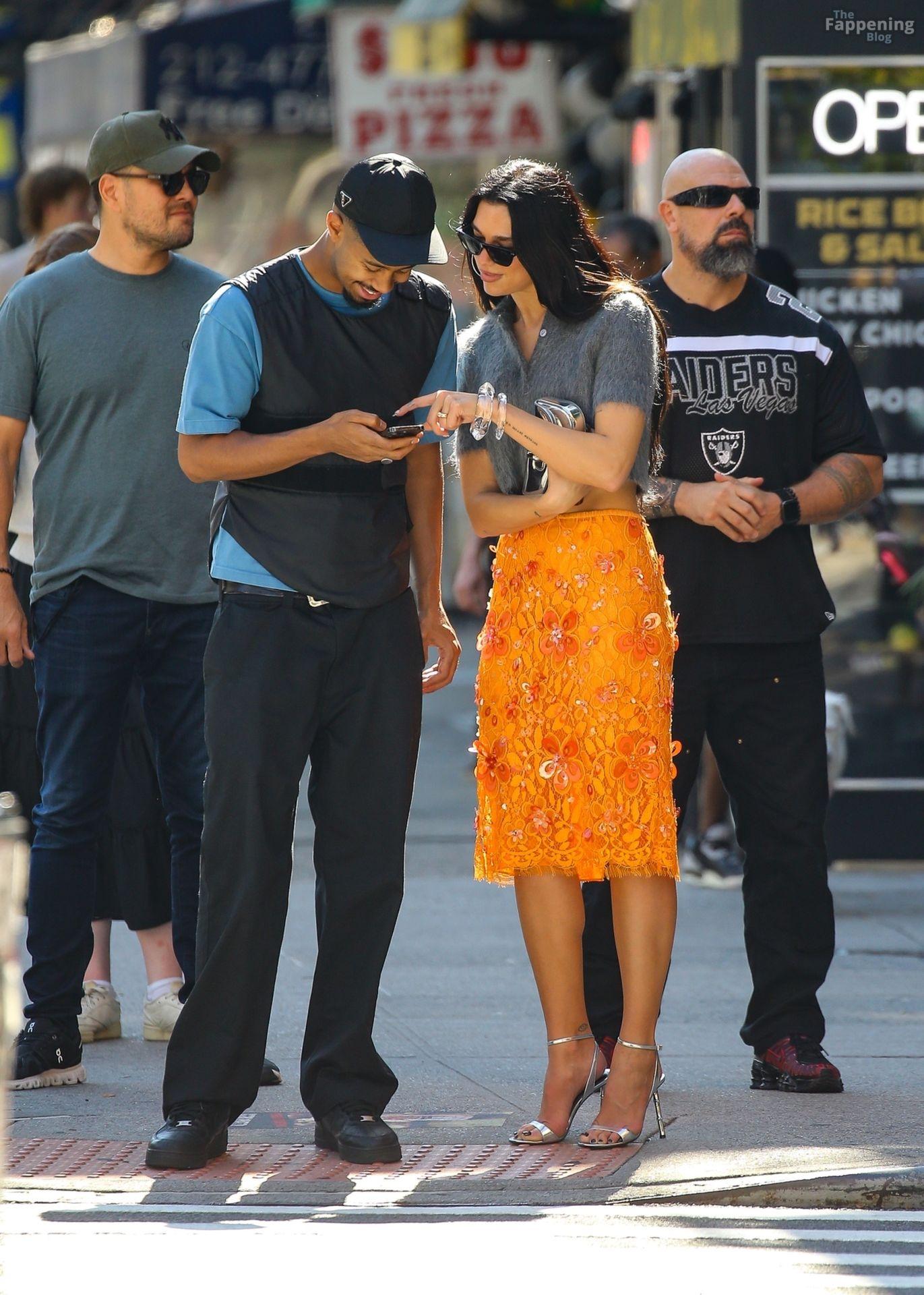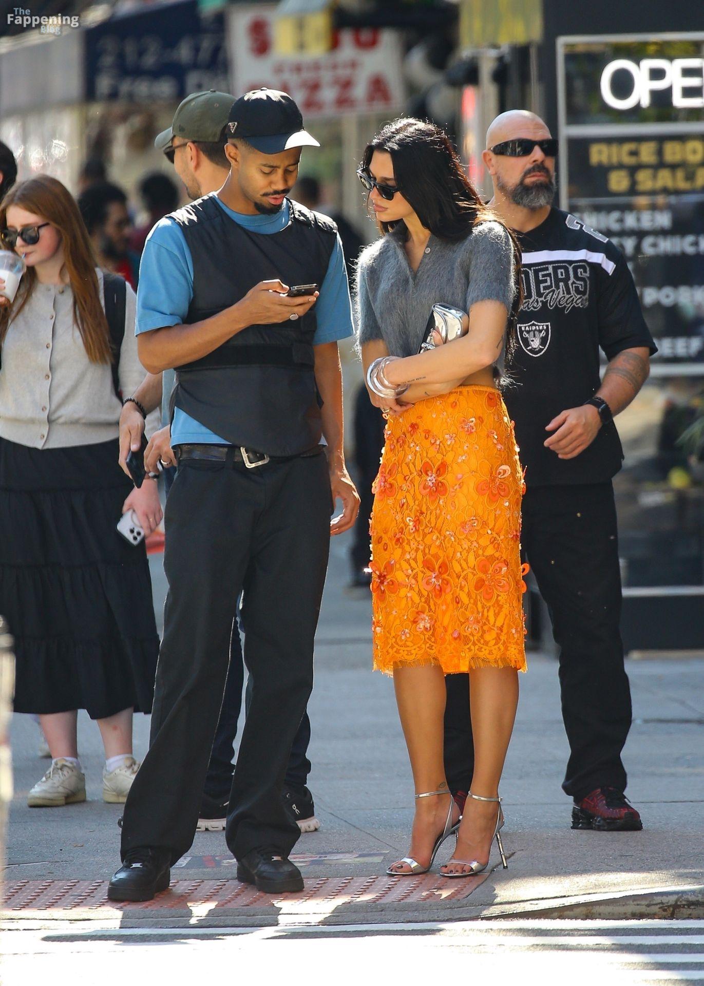 Singer Dua Lipa lookin’ mad stylish rockin’ an orange Gucci floral long skirt, a mini fur grey shirt, silver heels, a silver mini purse, a clear bracelet, and shades while strollin’ through New York.