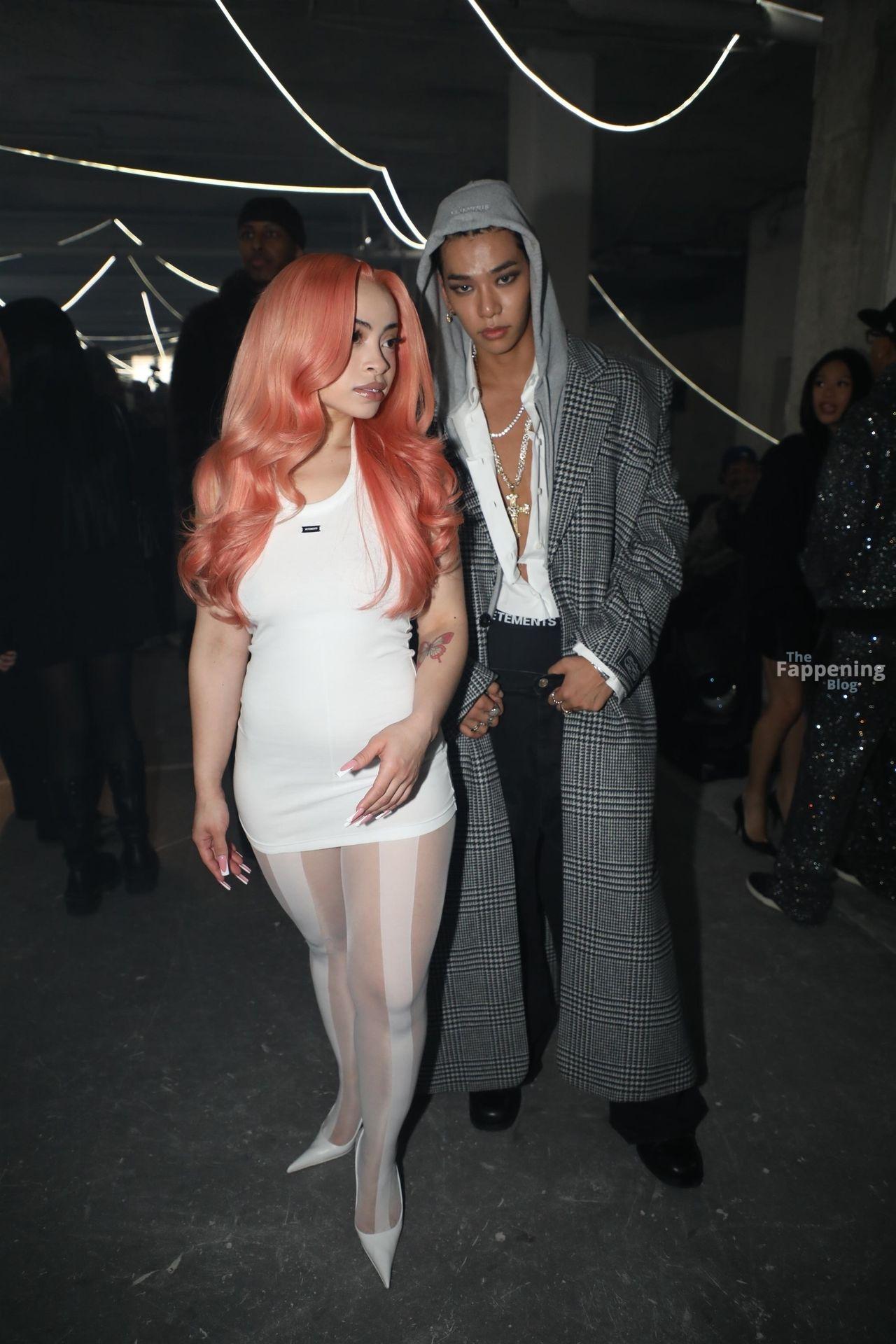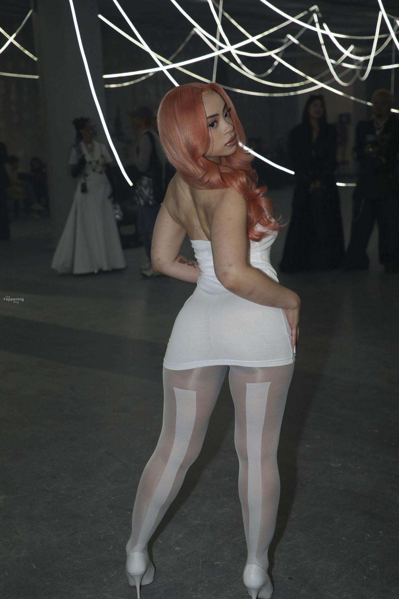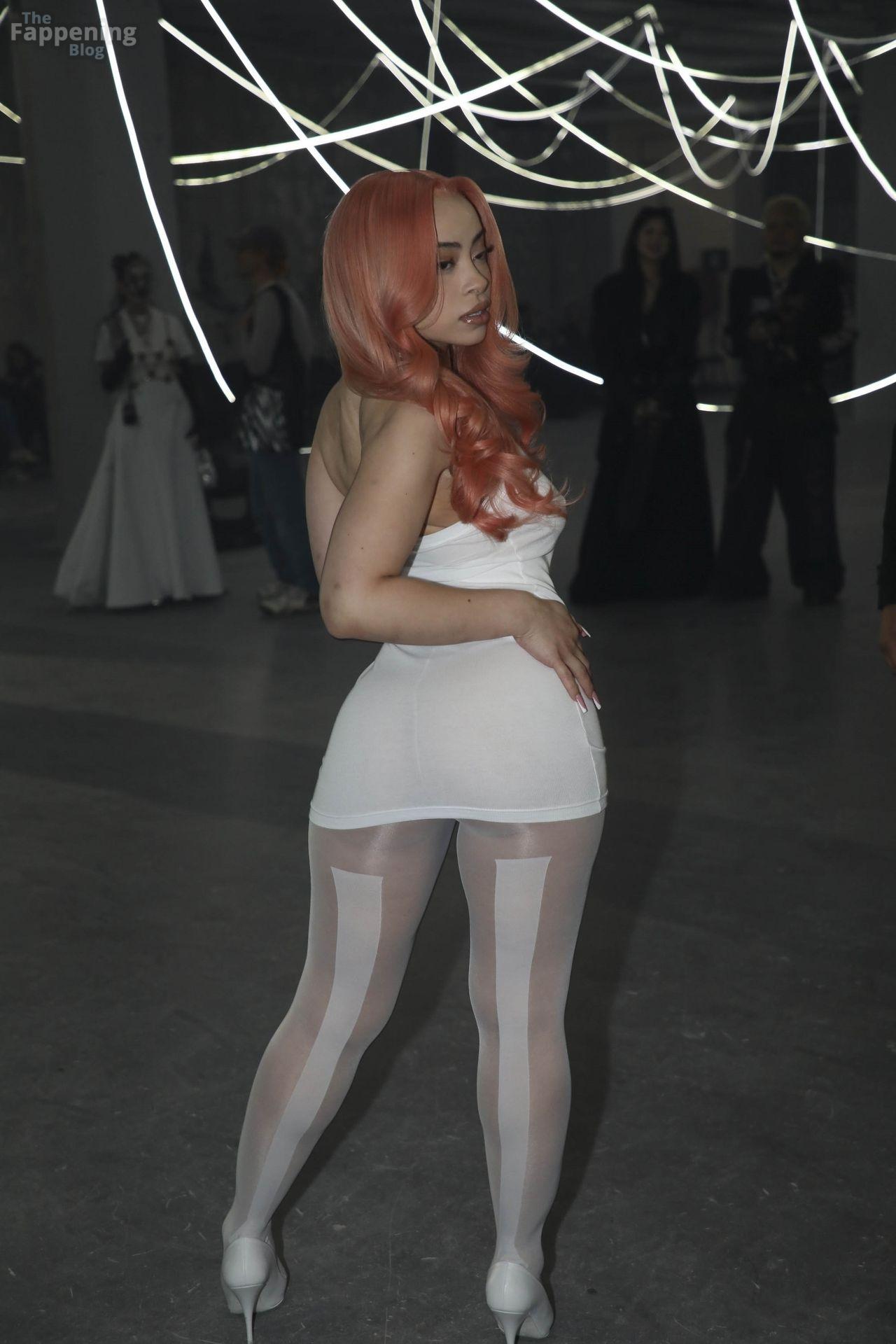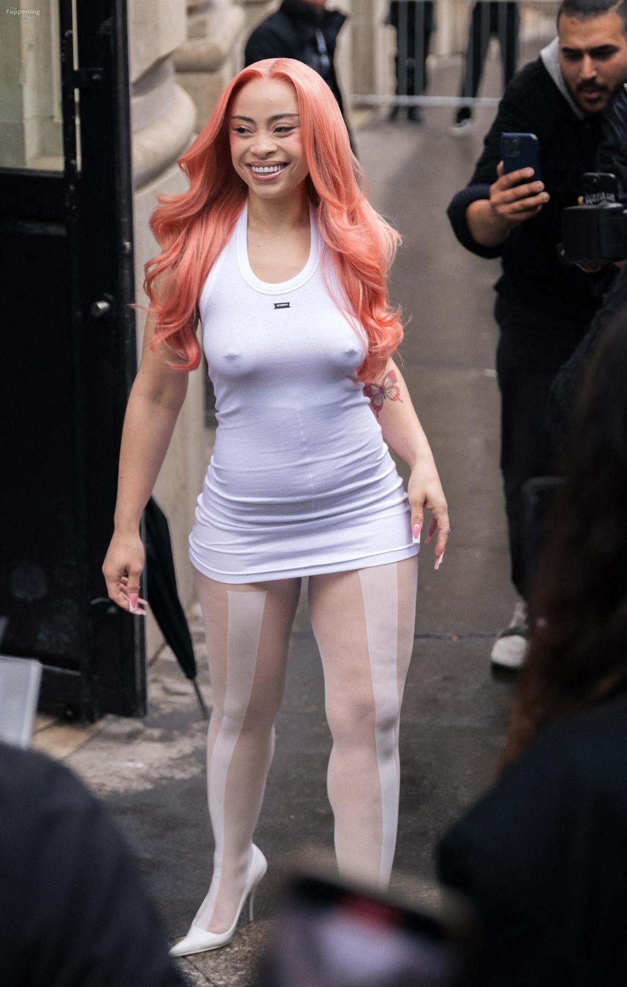 Ice Spice shows off her assets in a tight mini and see-through tights at VETEMENTS Paris Fashion Week.