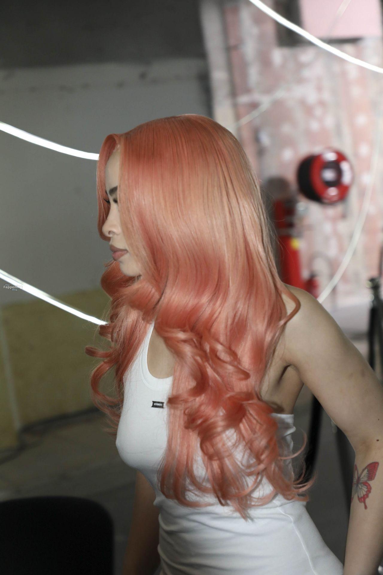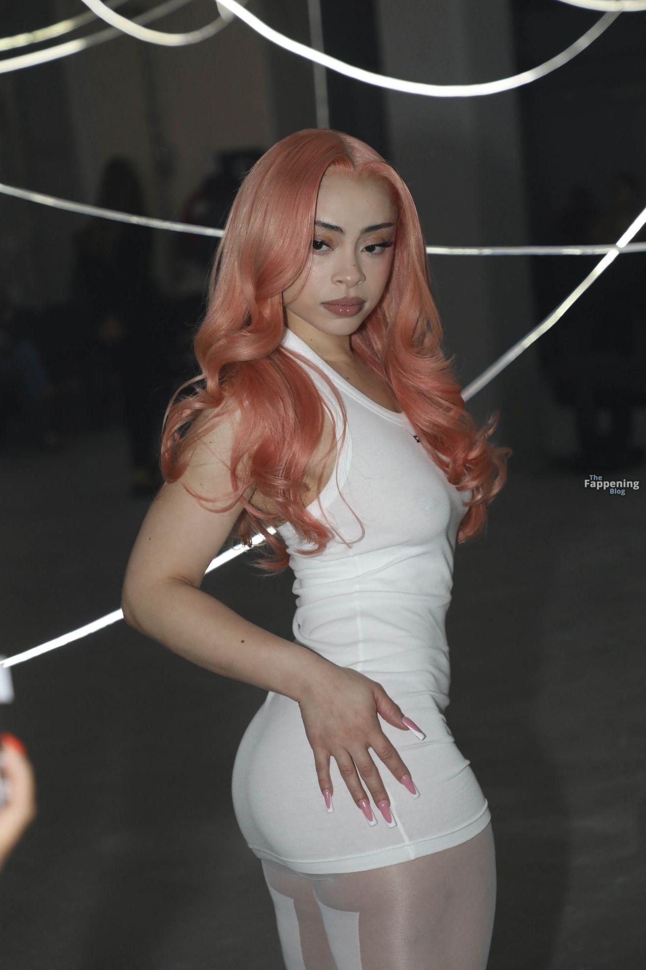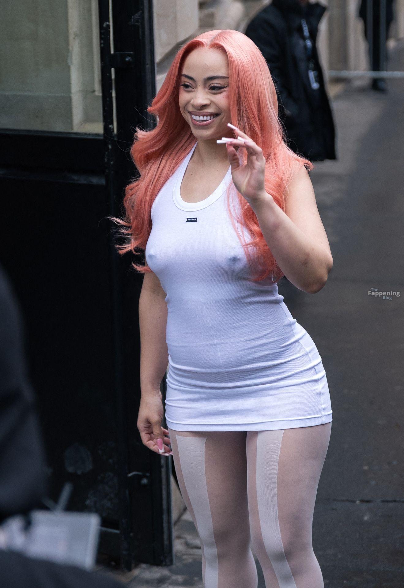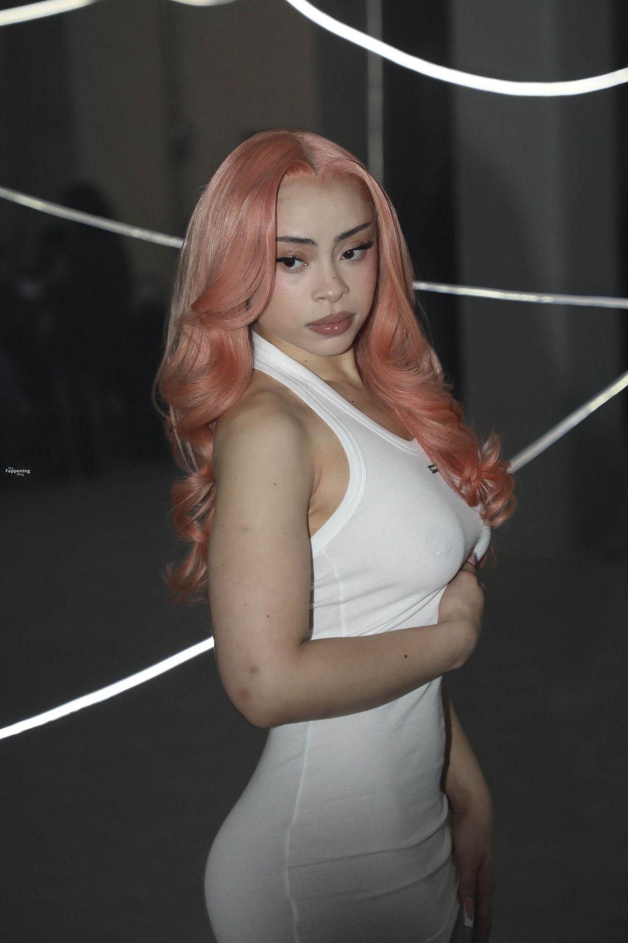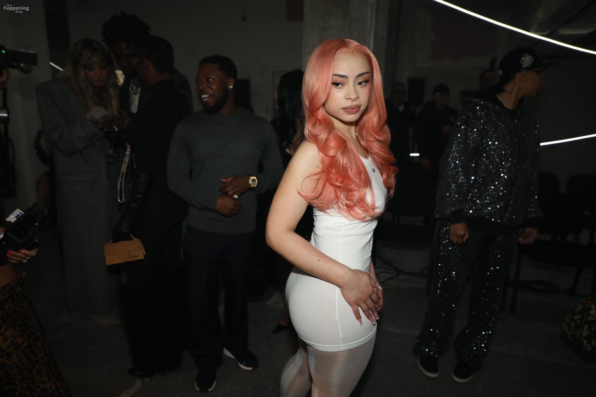 Ice Spice shows off her assets in a tight mini and see-through tights at VETEMENTS Paris Fashion Week.