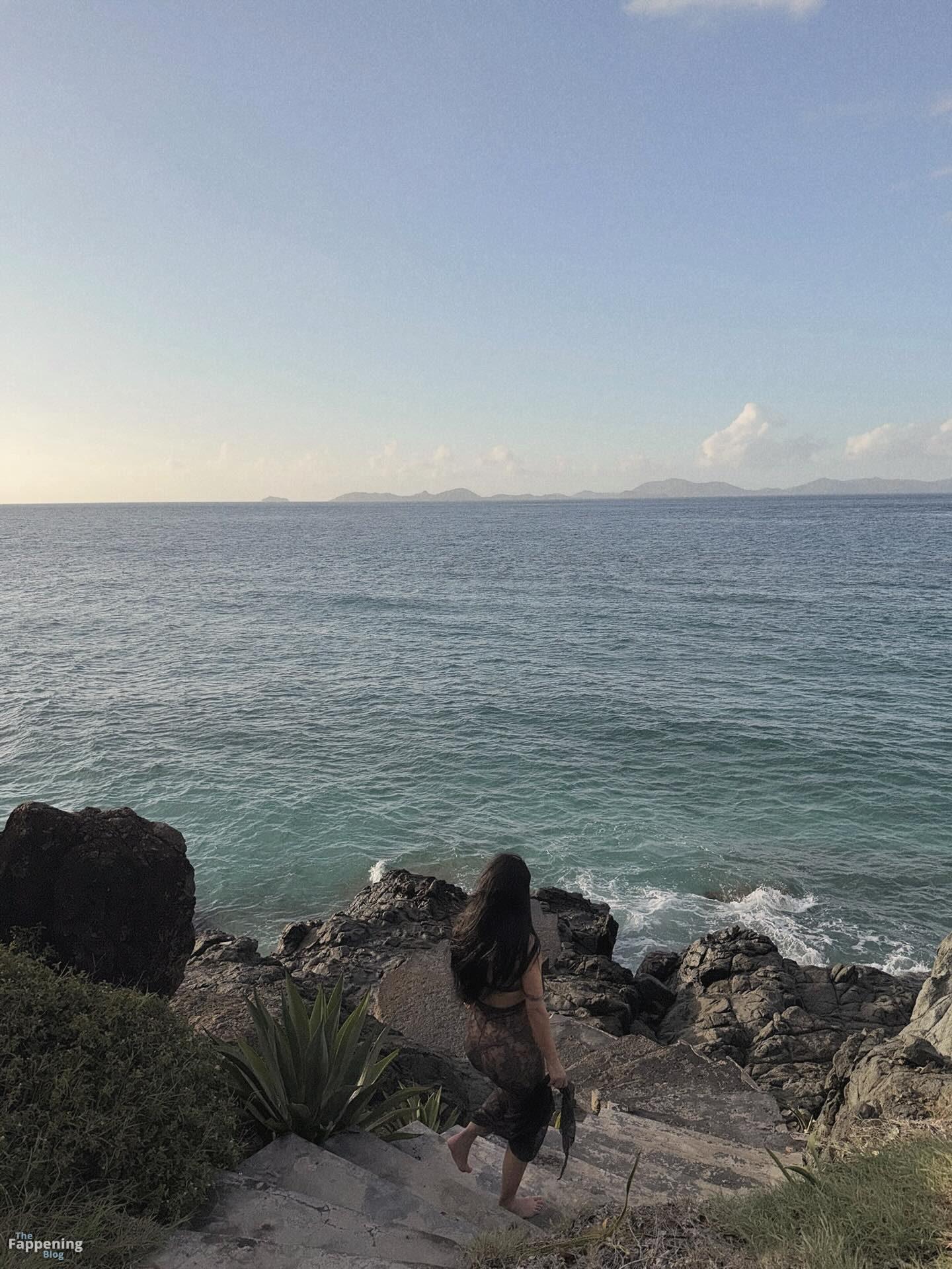 Kim Kardashian is in a beachside photoshoot, rockin’ a sheer lace dress, showin’ her boobs and booty.