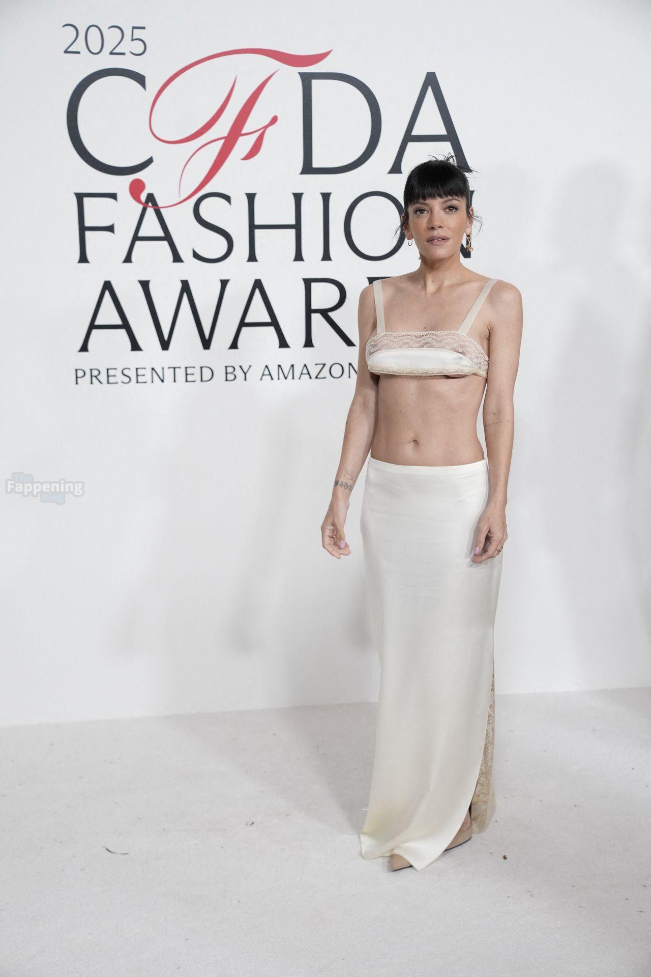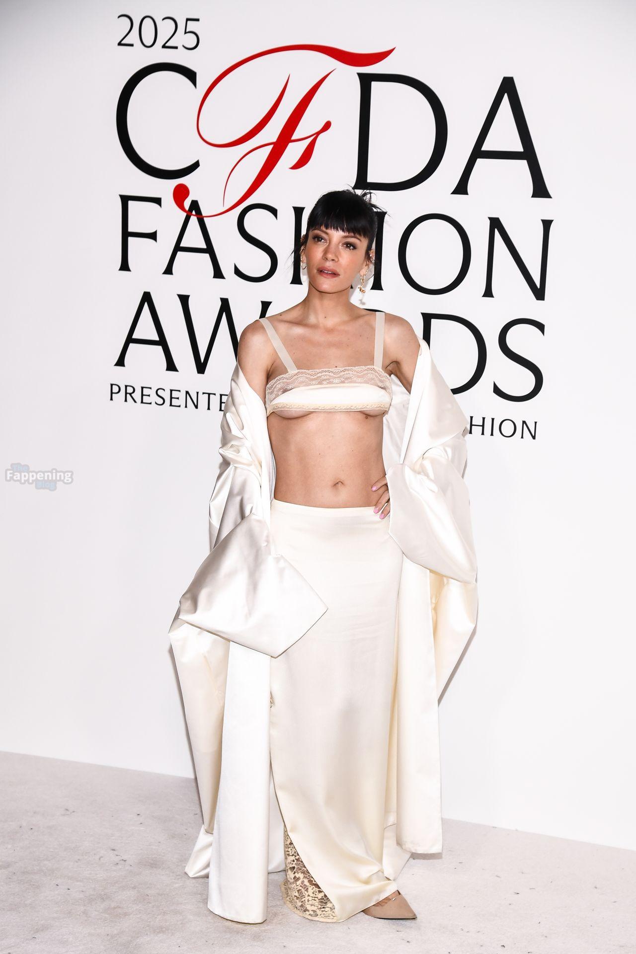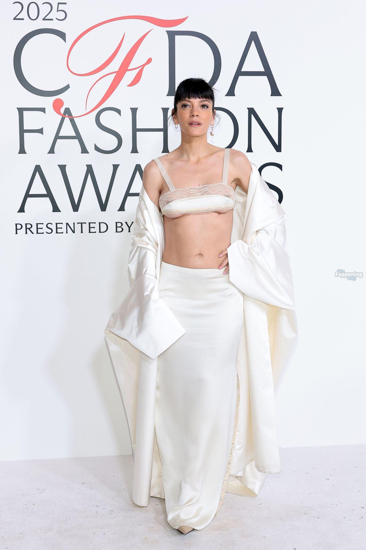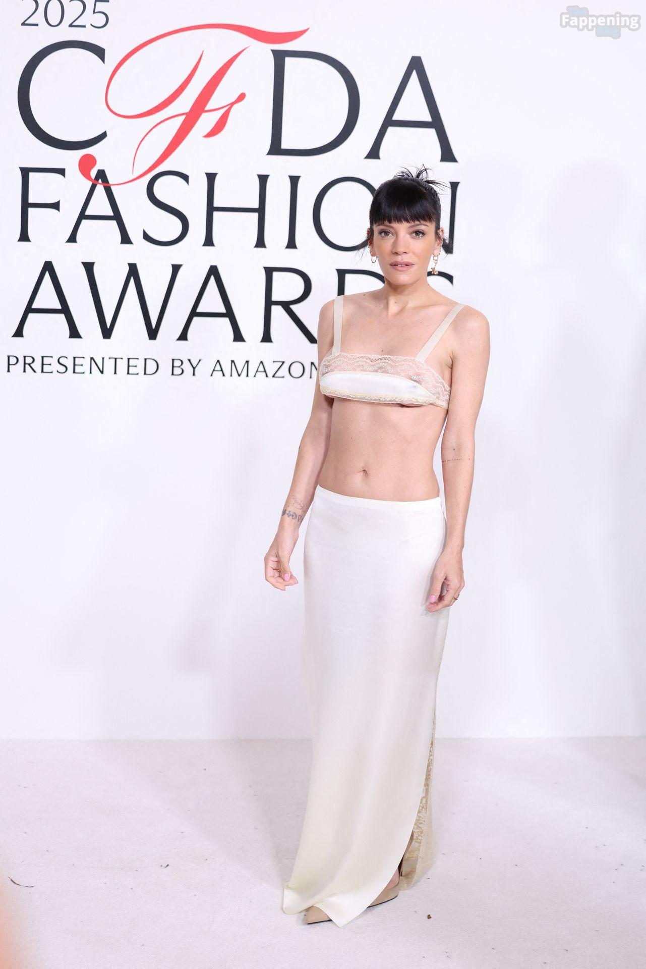 Singer Lily Allen is pictured braless while walkin’ on the red carpet at the 2025 CFDA Fashion Awards held at the American Museum of Natural History in New York.
