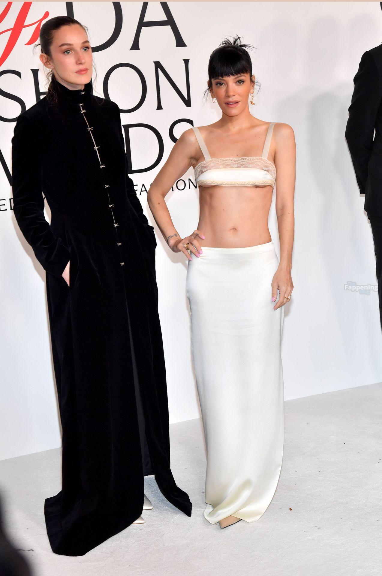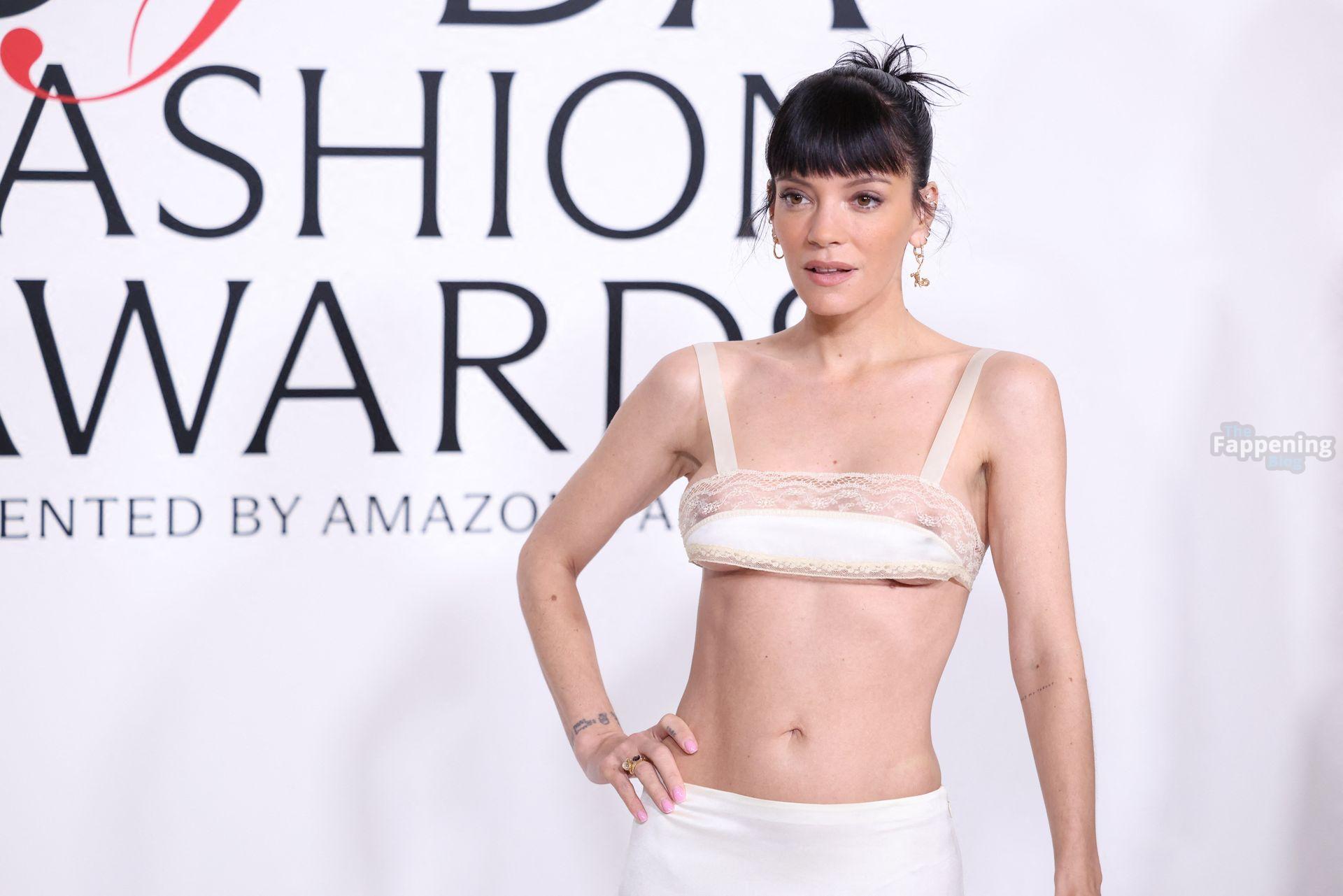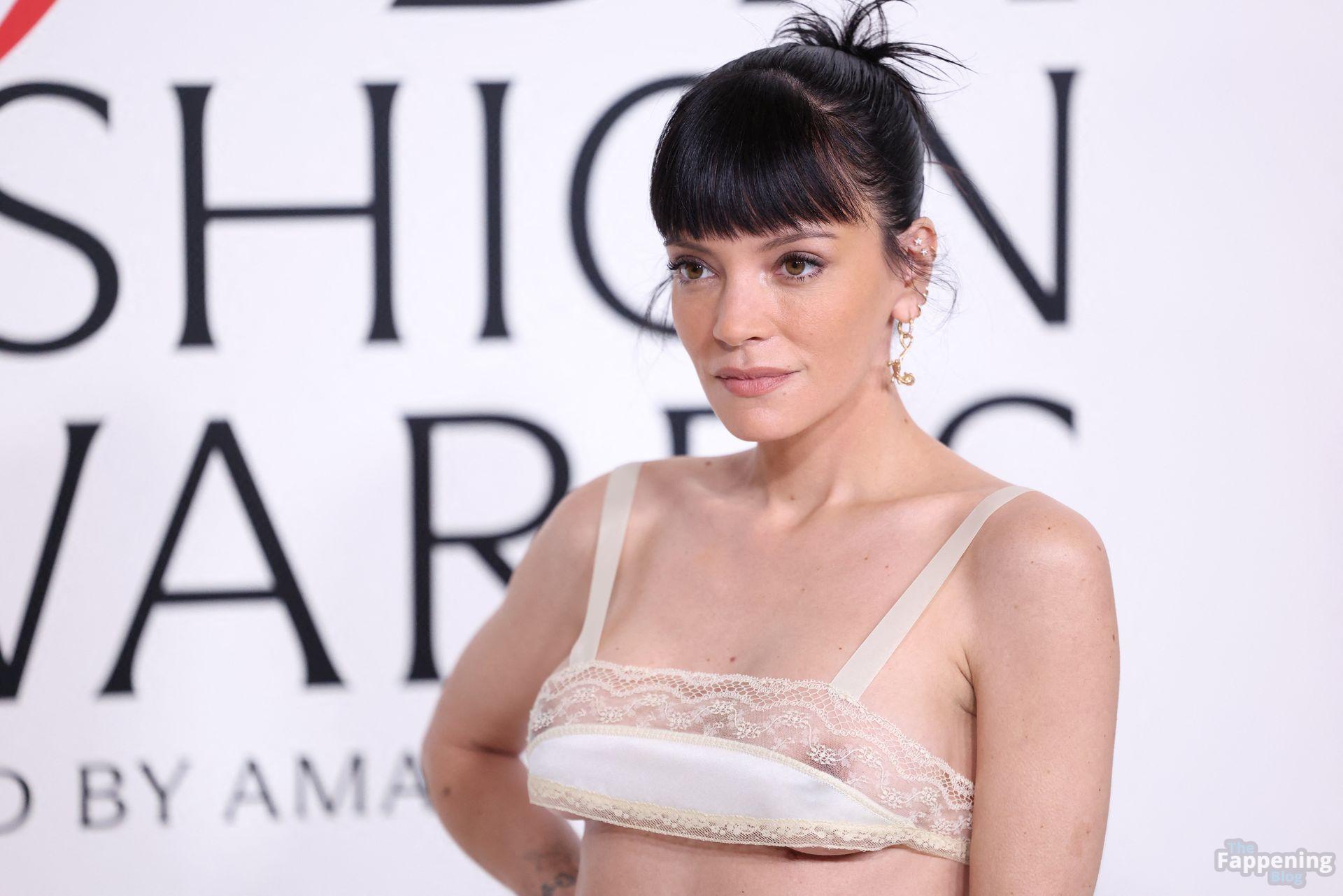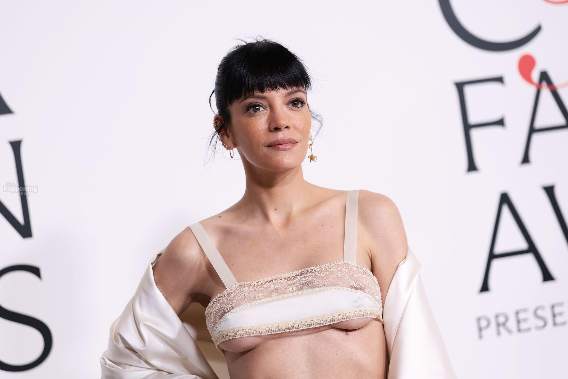 Singer Lily Allen is pictured braless while walkin’ on the red carpet at the 2025 CFDA Fashion Awards held at the American Museum of Natural History in New York.