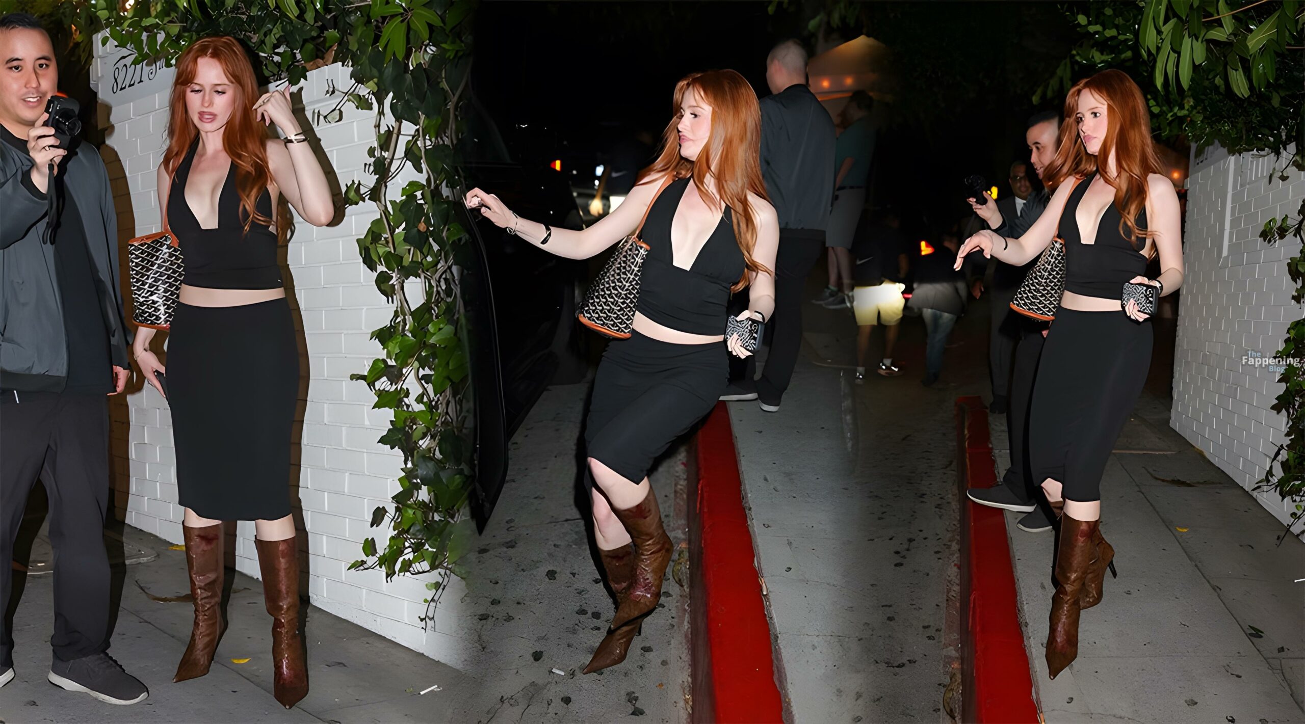 Madelaine Petsch was spotted leaving the Chateau Marmont wearing a black top, a black mini skirt, and brown pointed toe boots.