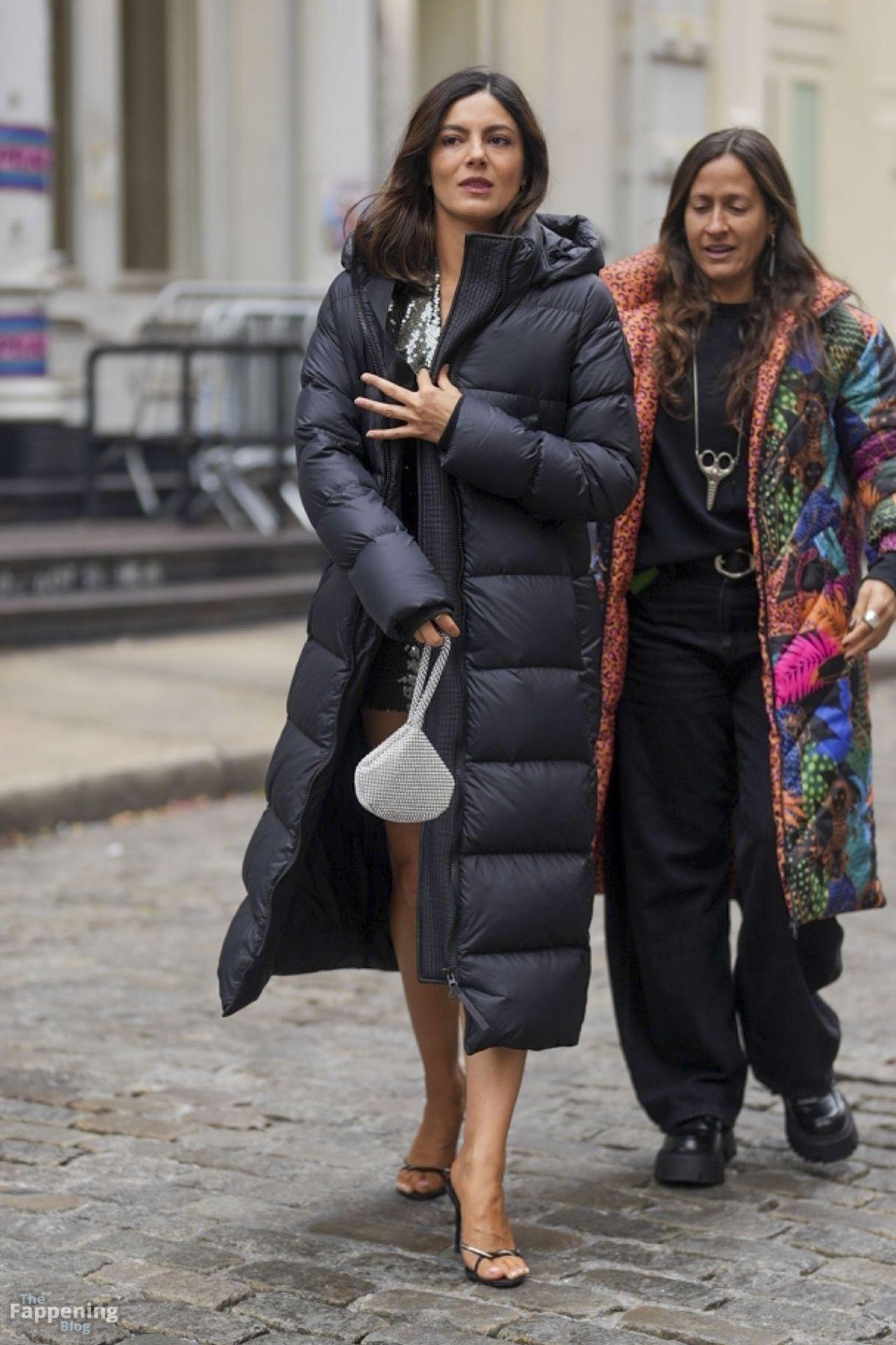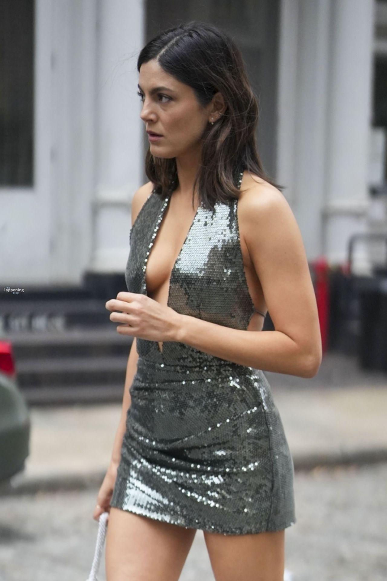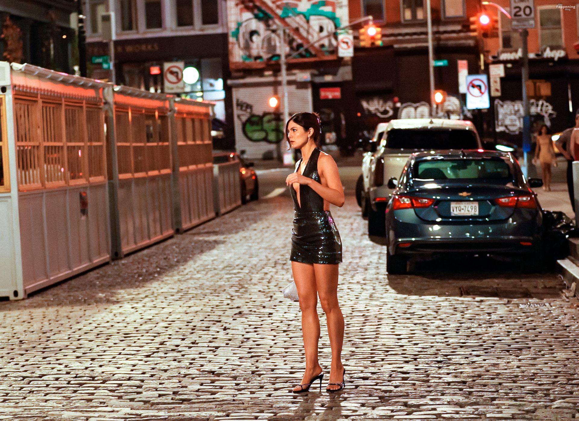 Braless Monica Barbaro stuns in a green sequin dress and stiletto high heels filming ‘One Night Only’ in New York City.