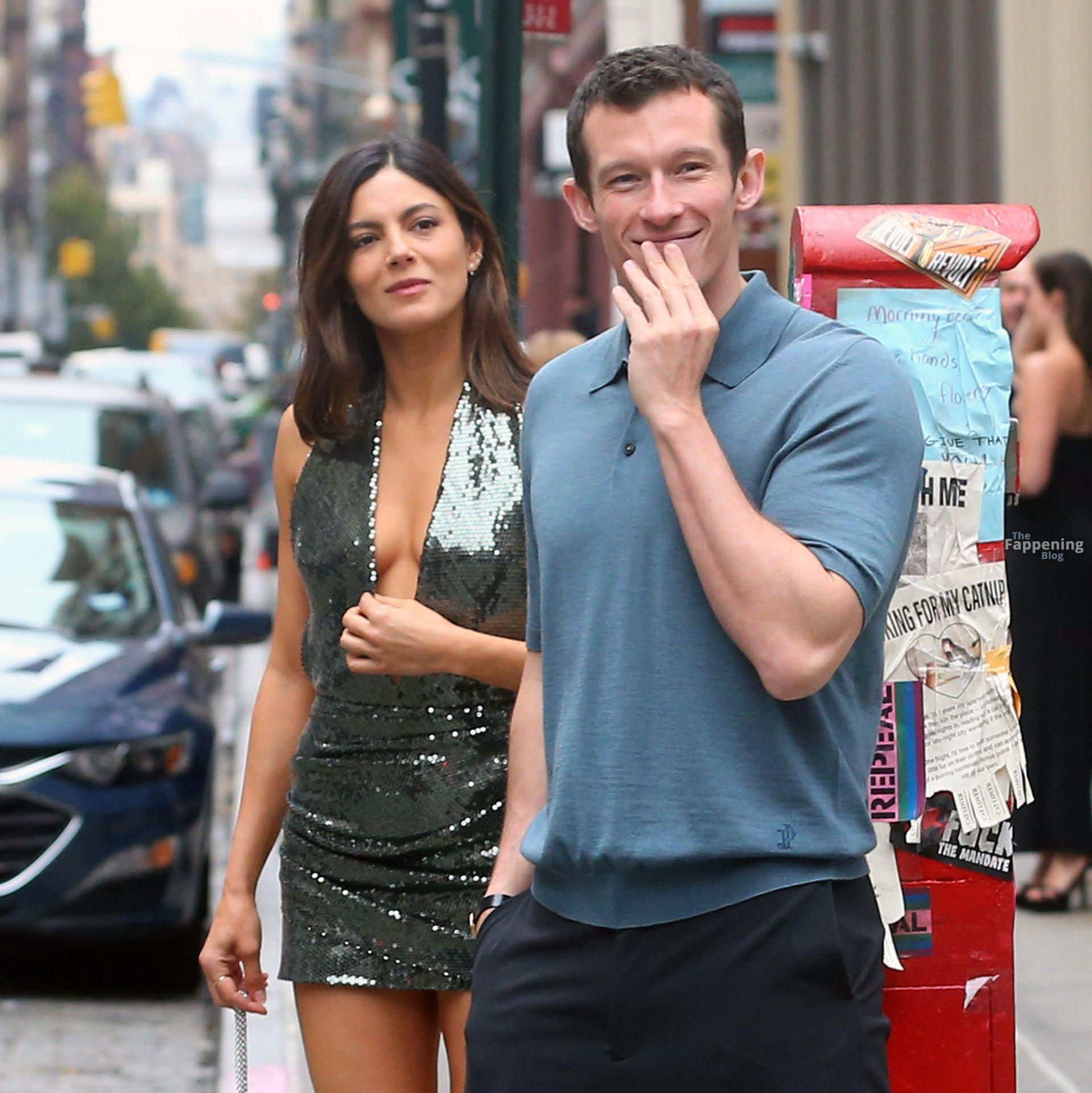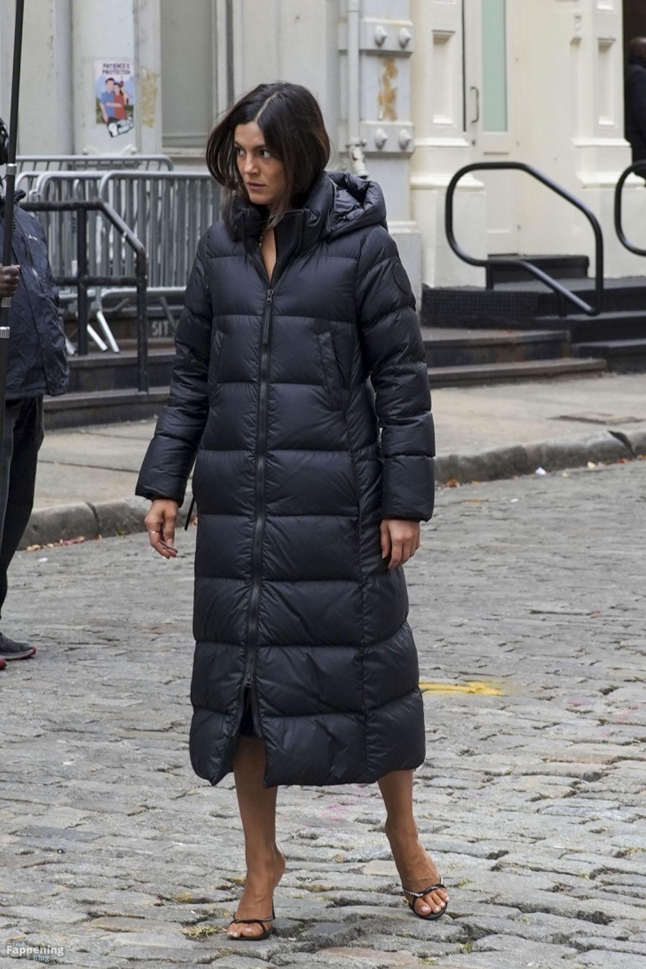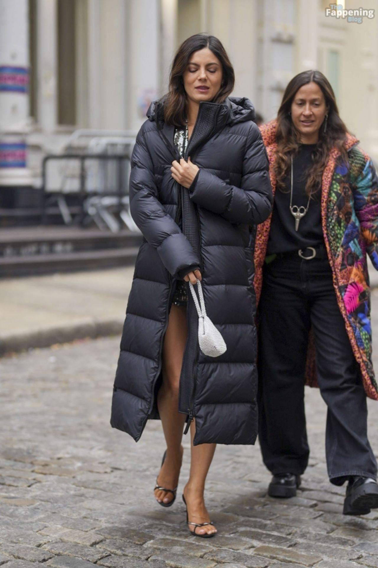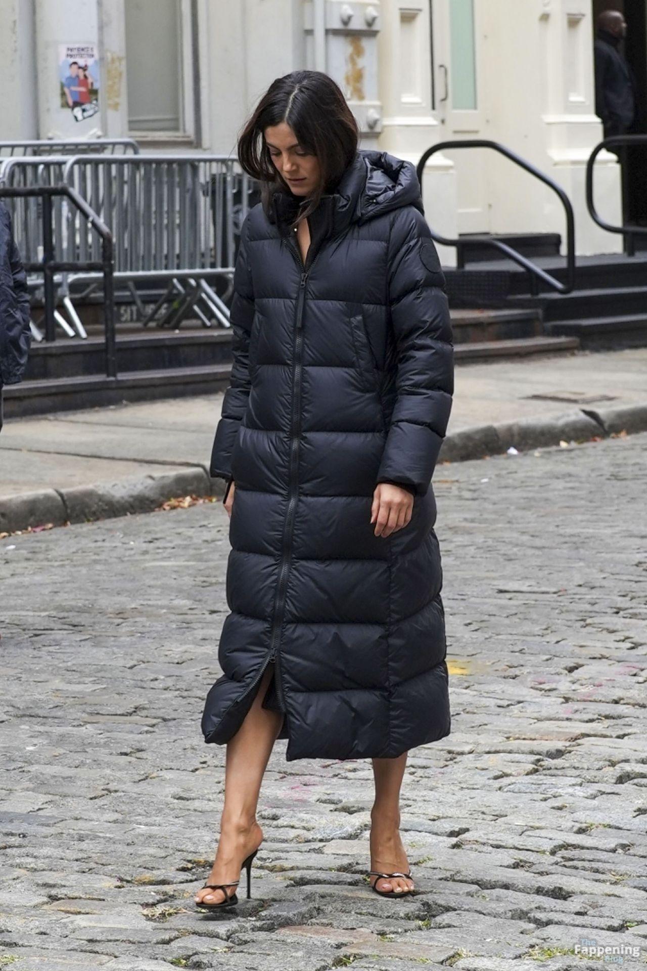 Braless Monica Barbaro stuns in a green sequin dress and stiletto high heels filming ‘One Night Only’ in New York City.
