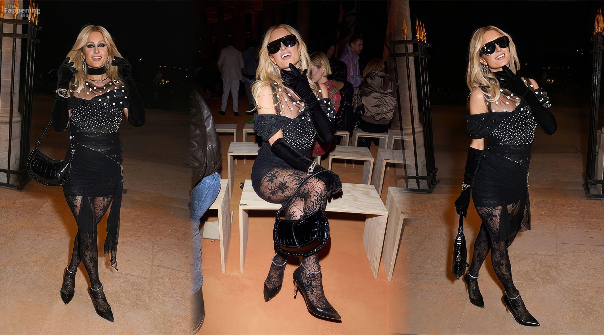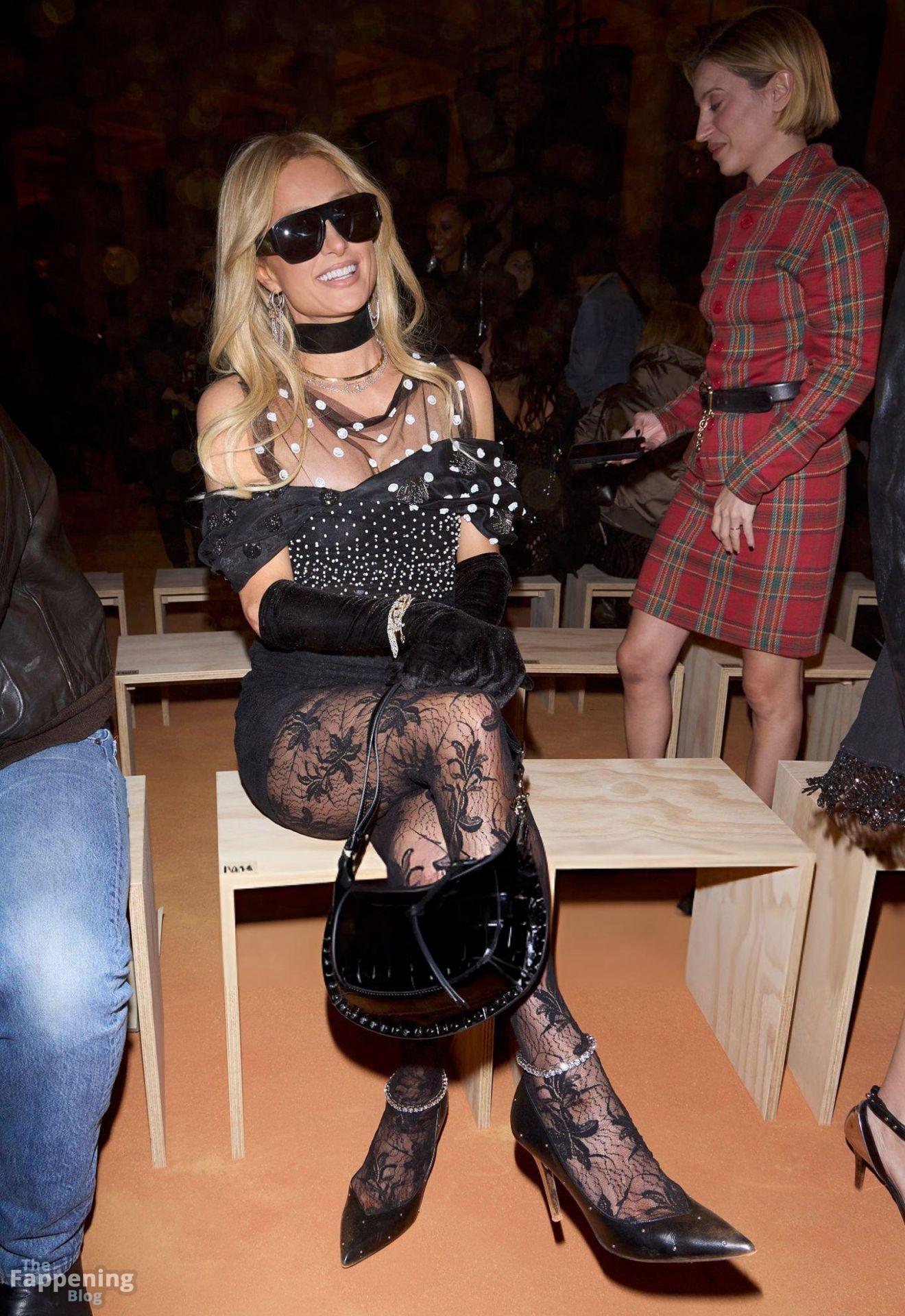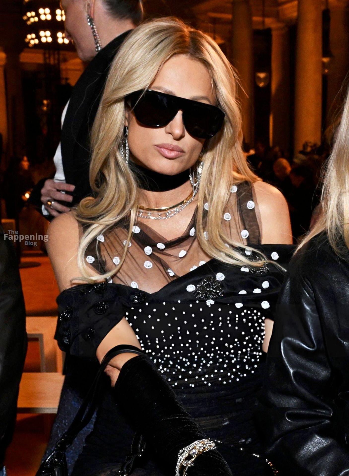 Paris Hilton showed off her sexy legs in a see-through black mini at Isabel Marant’s Paris Fashion Week show.