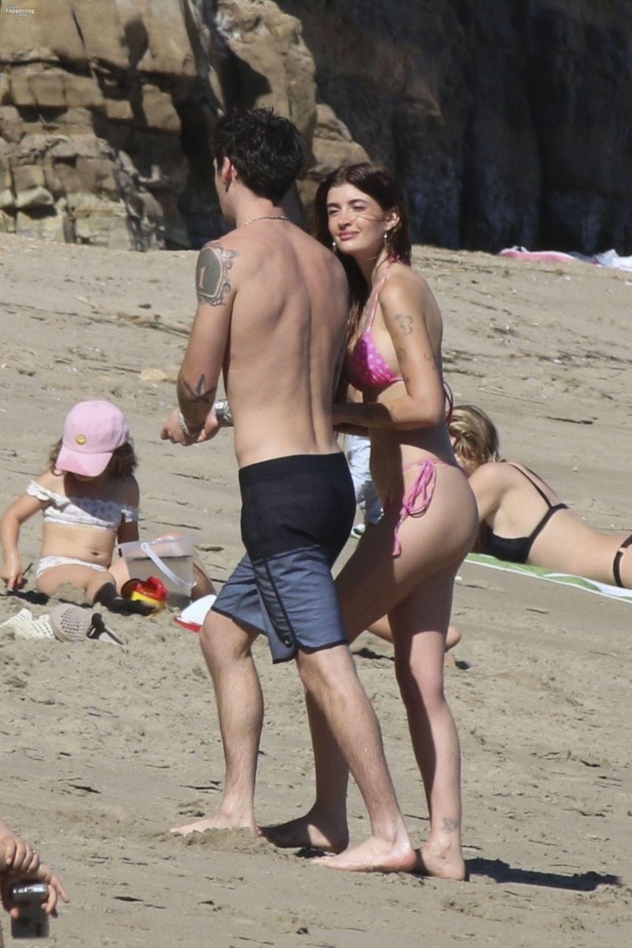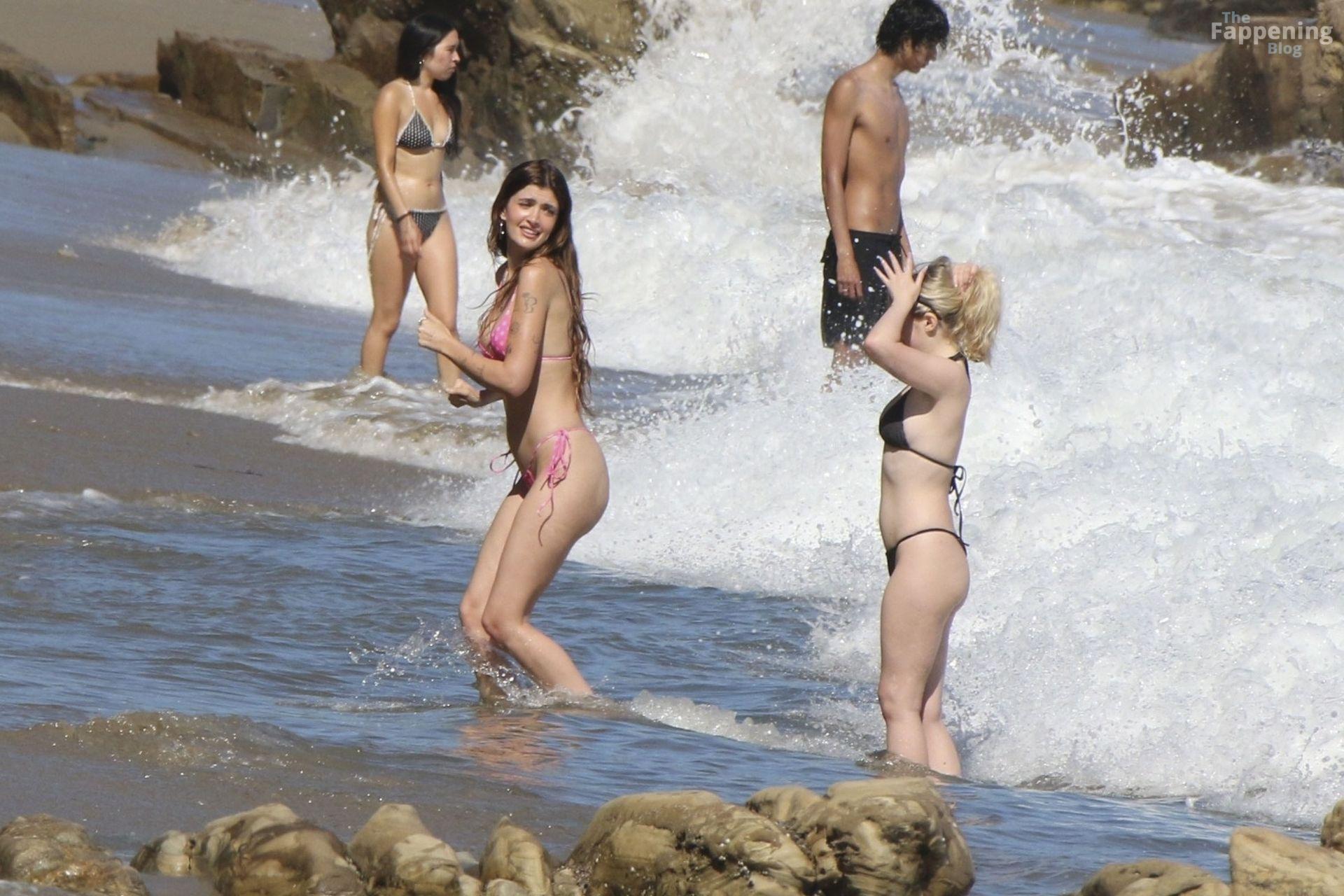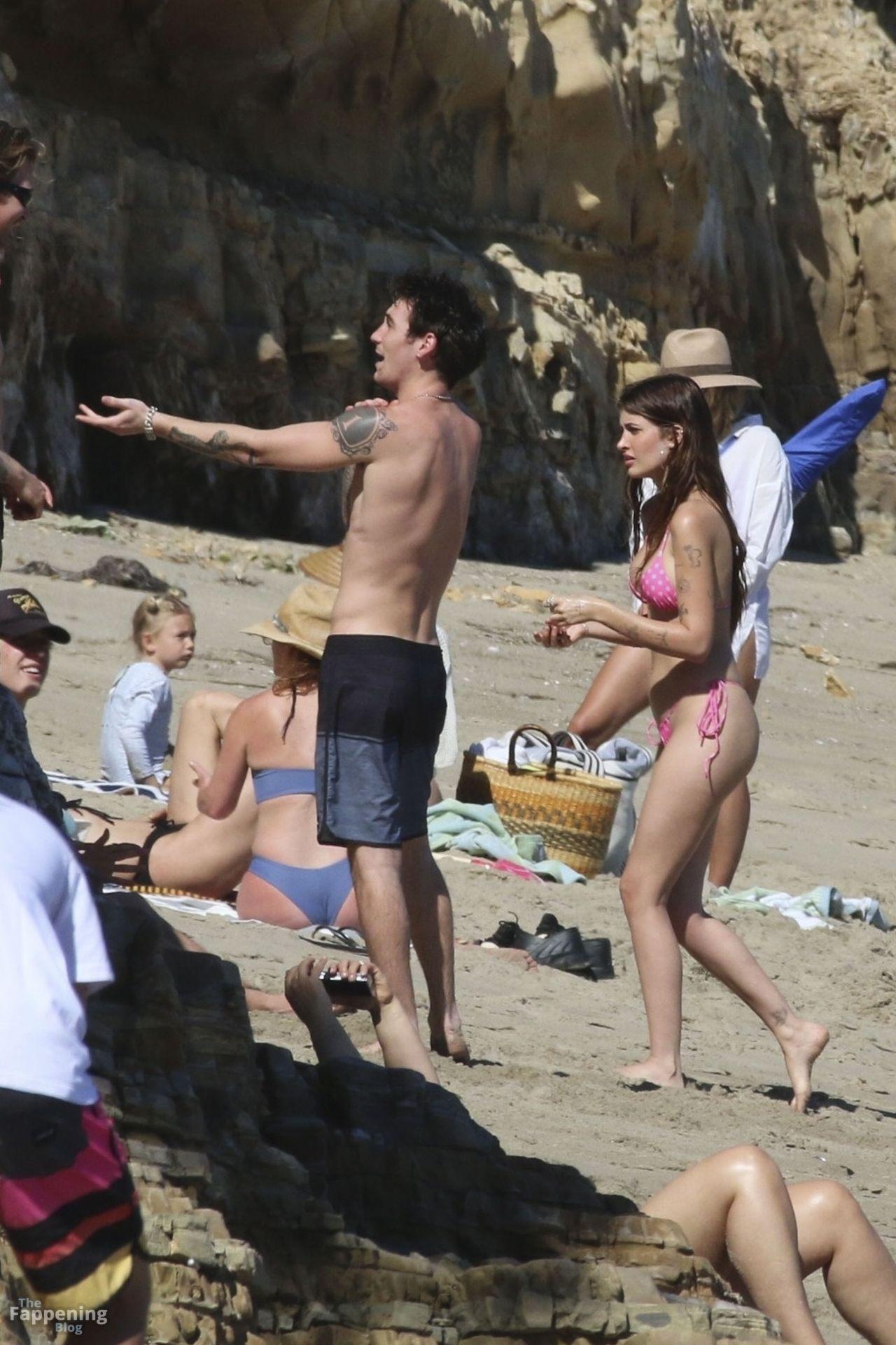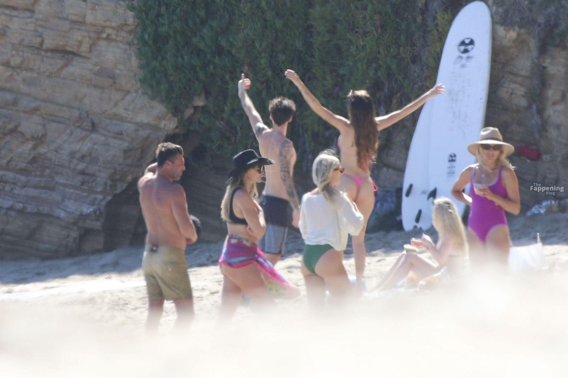 Model Sami Sheen is seen looking stunning in a pink thong bikini while picking up shells and enjoying a sunny day on the beach with believed to be boyfriend and friends in Malibu, California.