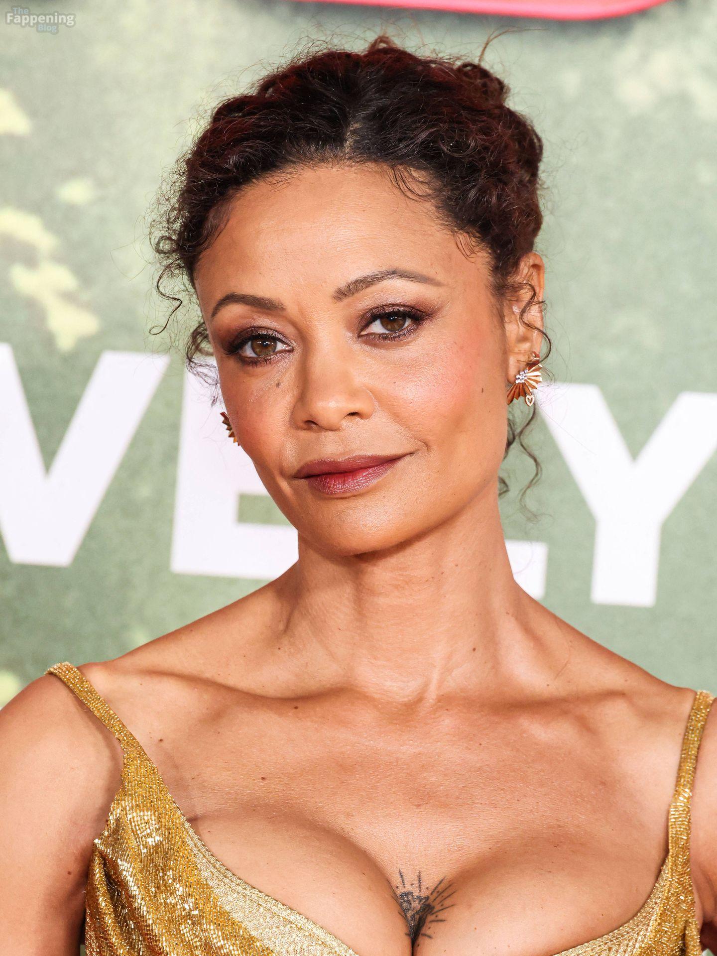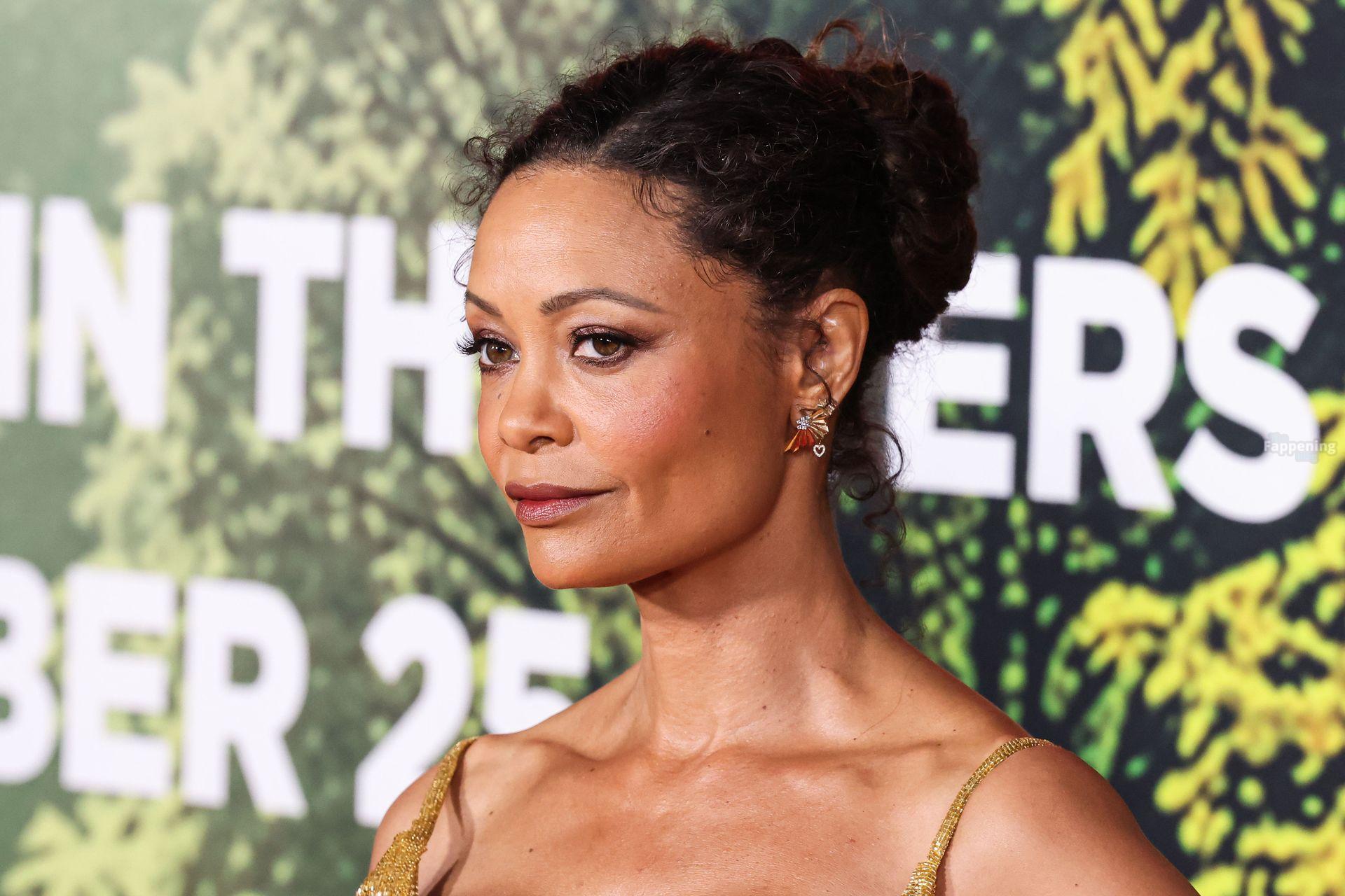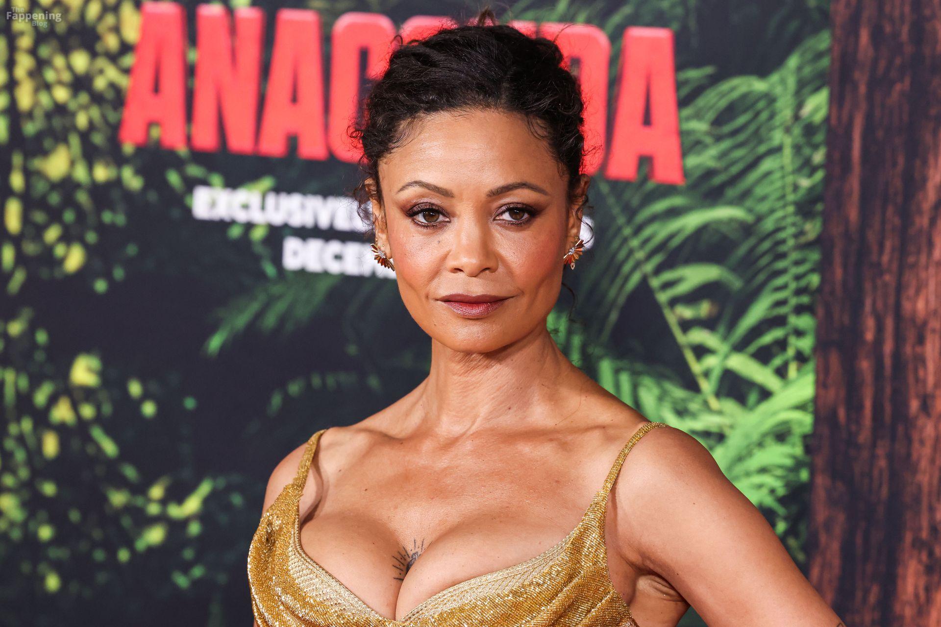 Thandie Newton (53) stuns in a golden dress at the “Anaconda” premiere at the United Theater on Broadway in Los Angeles. Check out her stunning red carpet photos below.