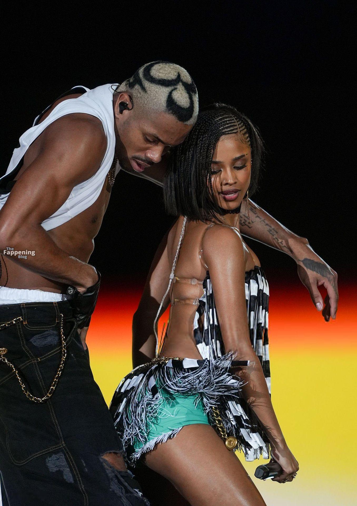 Tyla looked hot at the Global Citizen Festival in NYC, rockin’ a fringe dress over teal hotpants. She showed off her legs and ass in a performance.