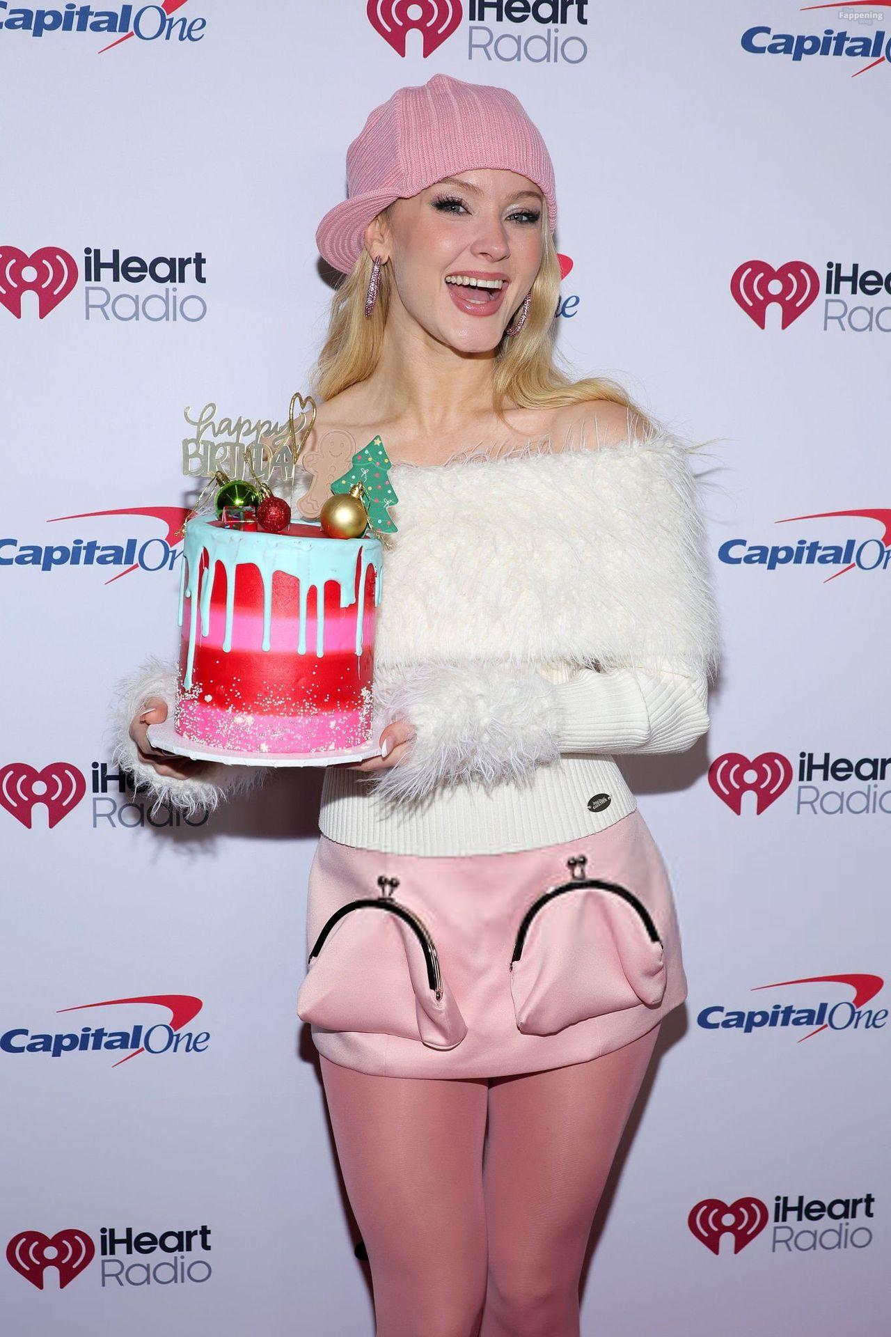 Swedish singer Zara Larsson displays her abs and sexy legs in a daring mini skirt and see-through top at the Jingle Ball 2025.